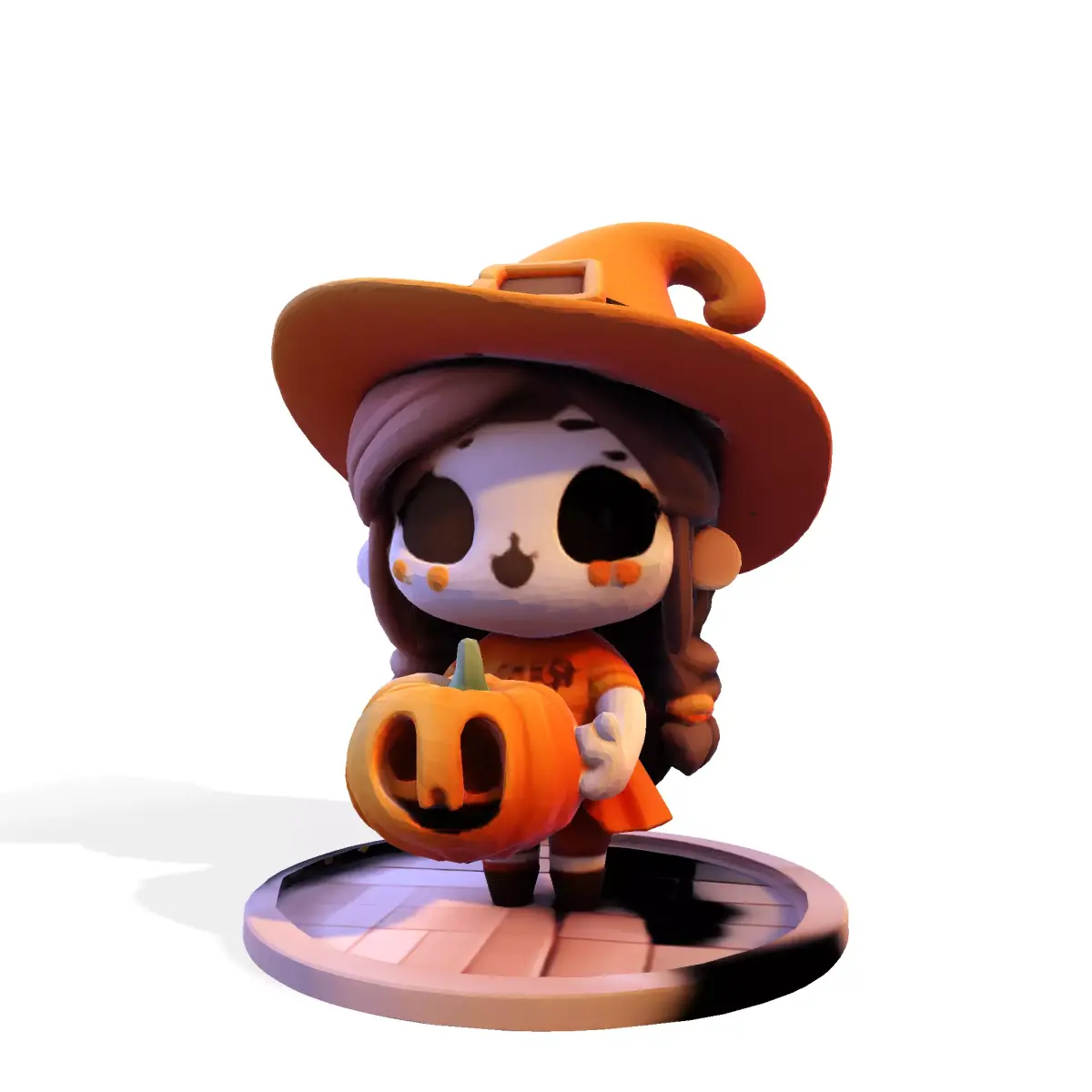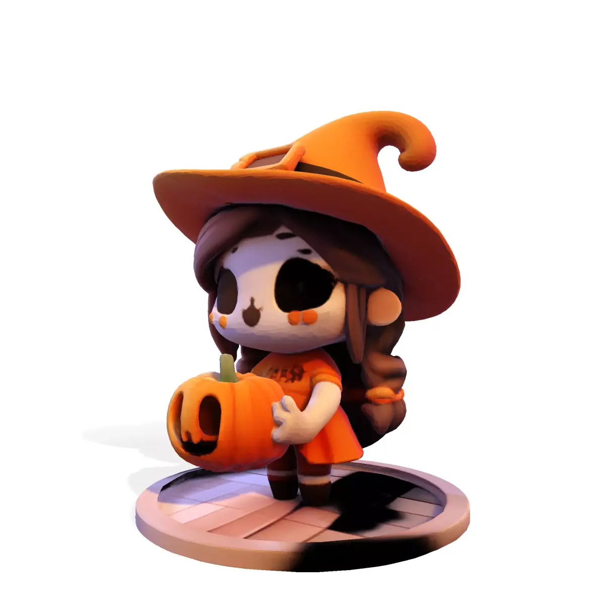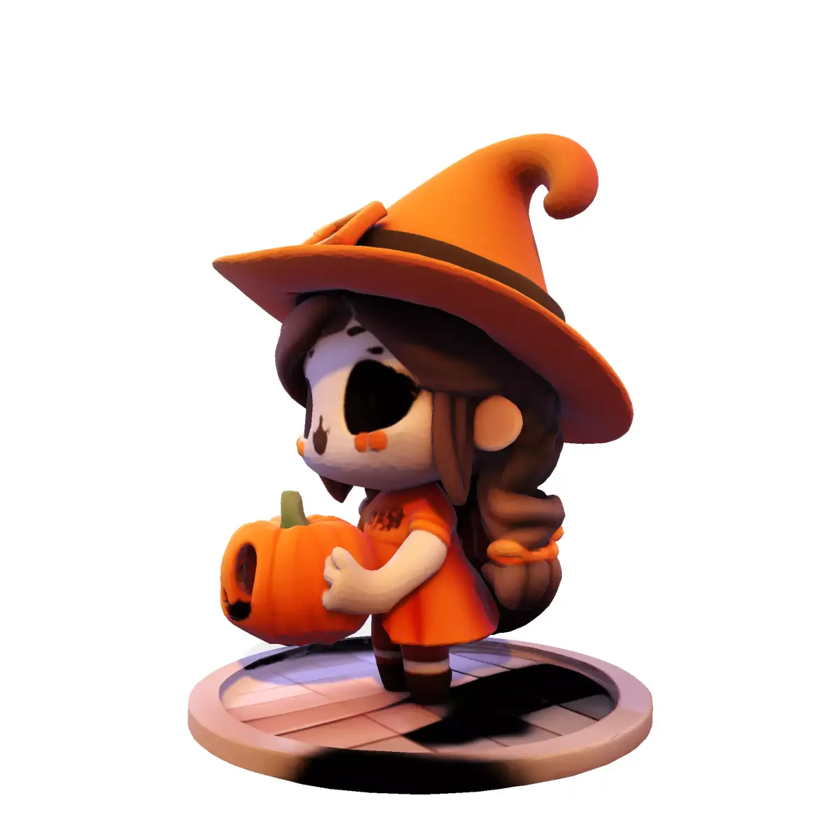 Cast a spell of cuteness with this adorable Chibi Halloween Witch & Pumpkin 3D Model! This enchanting low-poly character features a sweet, stylized witch with a classic pointed hat, flowing hair, and a charming, spooky face. She's seated playfully beside a carved jack-o'-lantern, all resting on a rustic wooden base.
