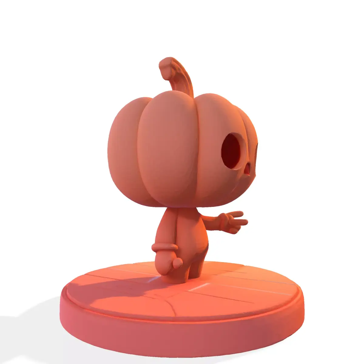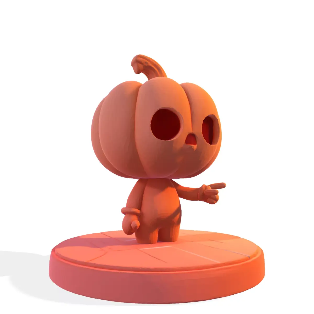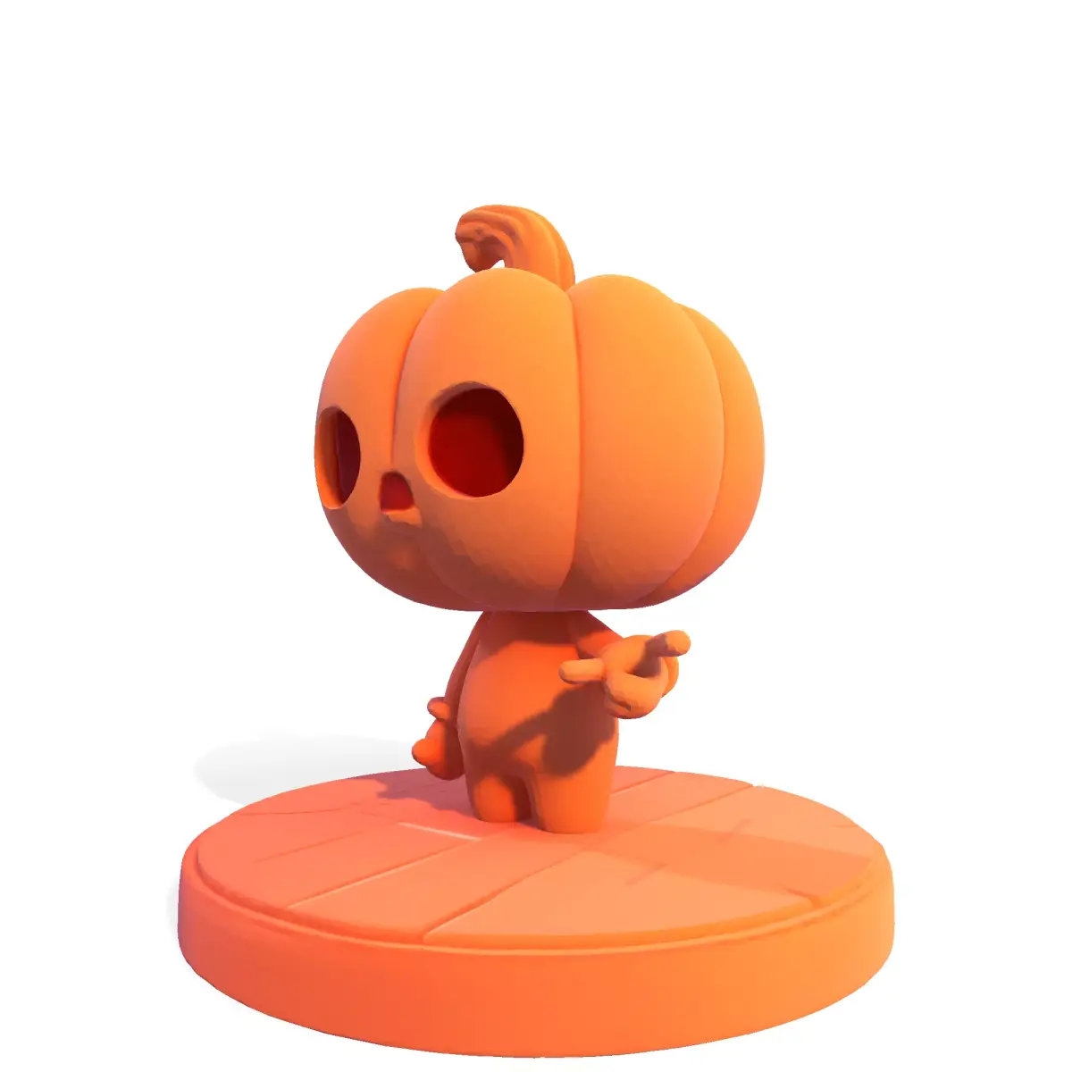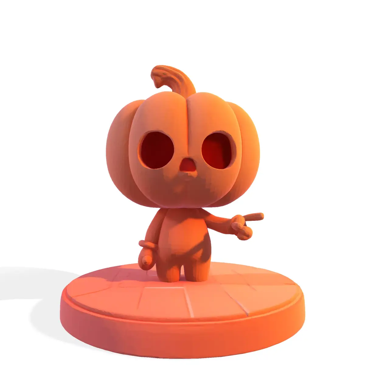 Presenting a charming and slightly spooky character: the Chibi Pumpkin Head 3D Model! This highly stylized figure features an oversized pumpkin head with carved-out eyes and a small mouth, standing on a circular, tiled base. Its simple, bold design and single-color render highlight the clean, smooth geometry.