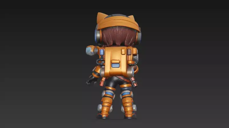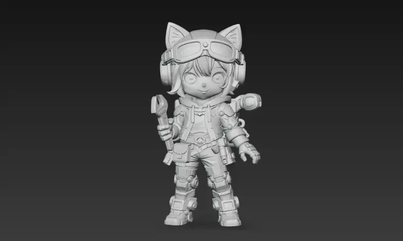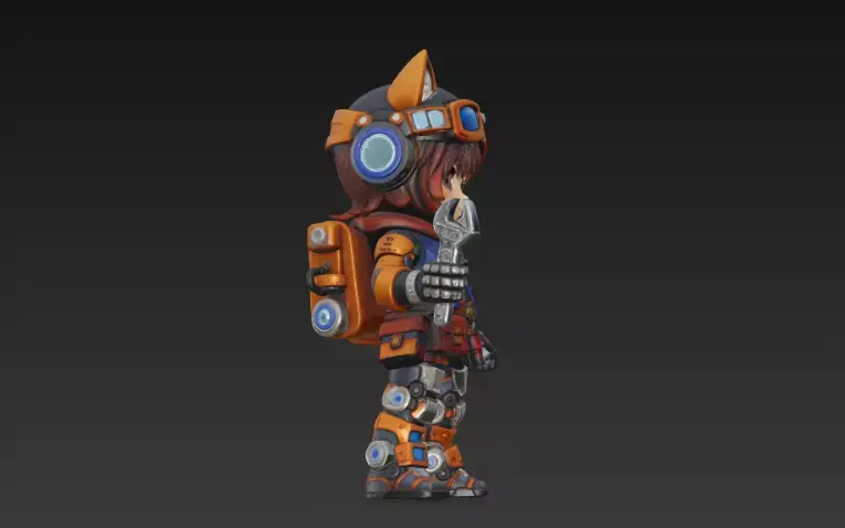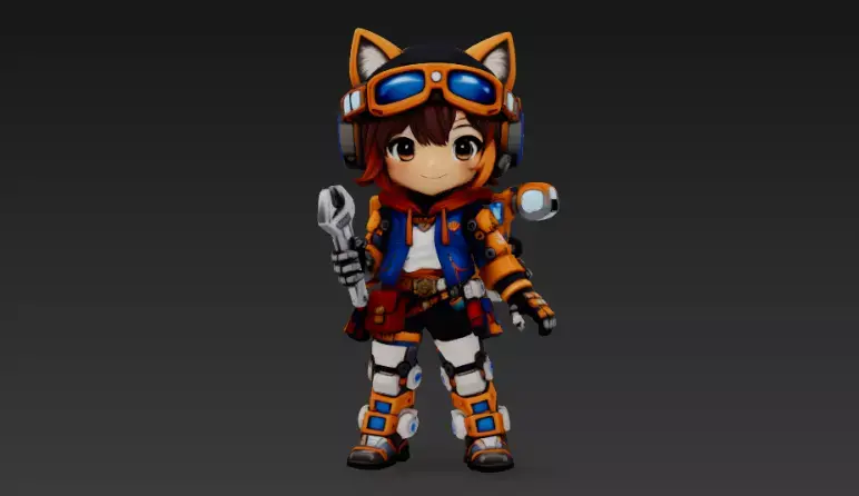 This stylized chibi tech mechanic is perfect as a hero character, NPC, or mascot for sci-fi and adventure games. The character features a cute anime-inspired face, cat-ear headset, bright orange-and-blue jacket, and detailed robotic leg armor, all supported by a large wrench and gadget backpack for a strong “engineer / fixer” vibe.