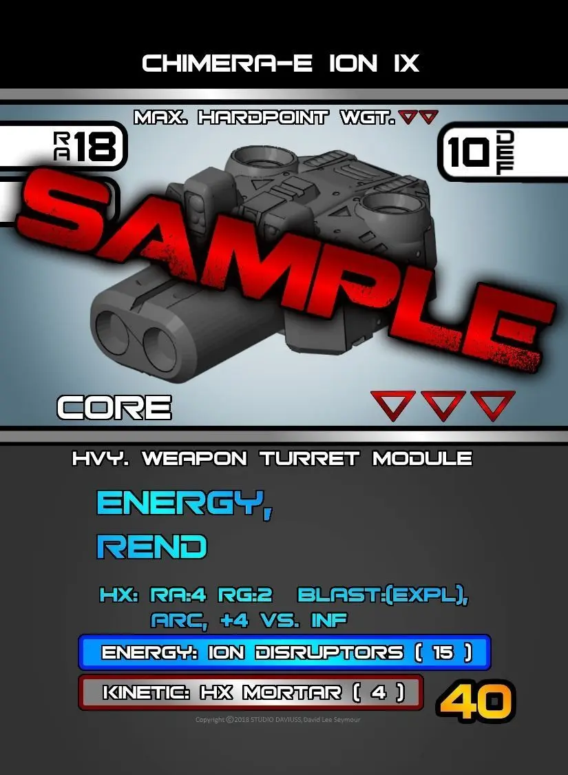 T-08 CHIMERA-E: The Chimera Energy/Plasma-based Turret type Heavy Core mounted with a Mk.IX Dual Ion Cannon, Sensor Suite and standard Anti-personnel Mortars. Thick Armor Plate protects the crew and Powercells as the Dual Ion Cannon inflicts mid-ranged Rending Energy damage Pulse Bursts. Supplied in standard A-2 configuration and ready to rock in open warfare or urban struggles.