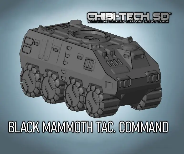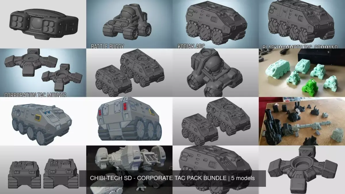 CORPORATION TAC PACK BUNDLE: EVERYTHING an upcoming Corporate Mission Commander needs to support His Troops on the next Mission! A full spread of situational support vehicles for You next loadout, this Bundle includes the following File packs ready for Resin or SUPPORTLESS FDM printing, as well as in-game CHIBI-TECH SD STAT CARDS.