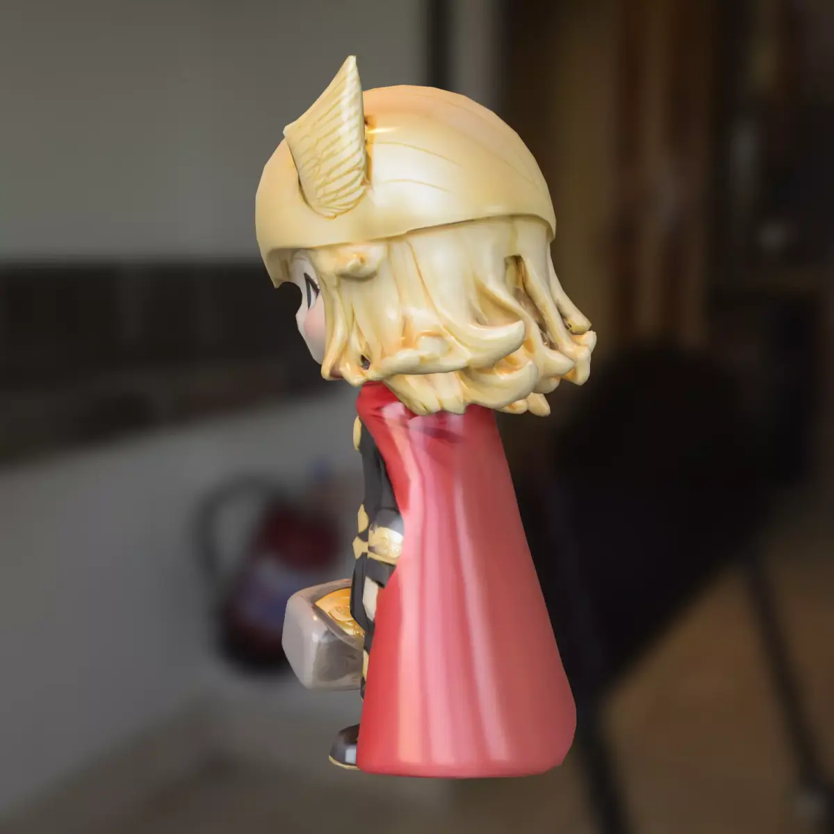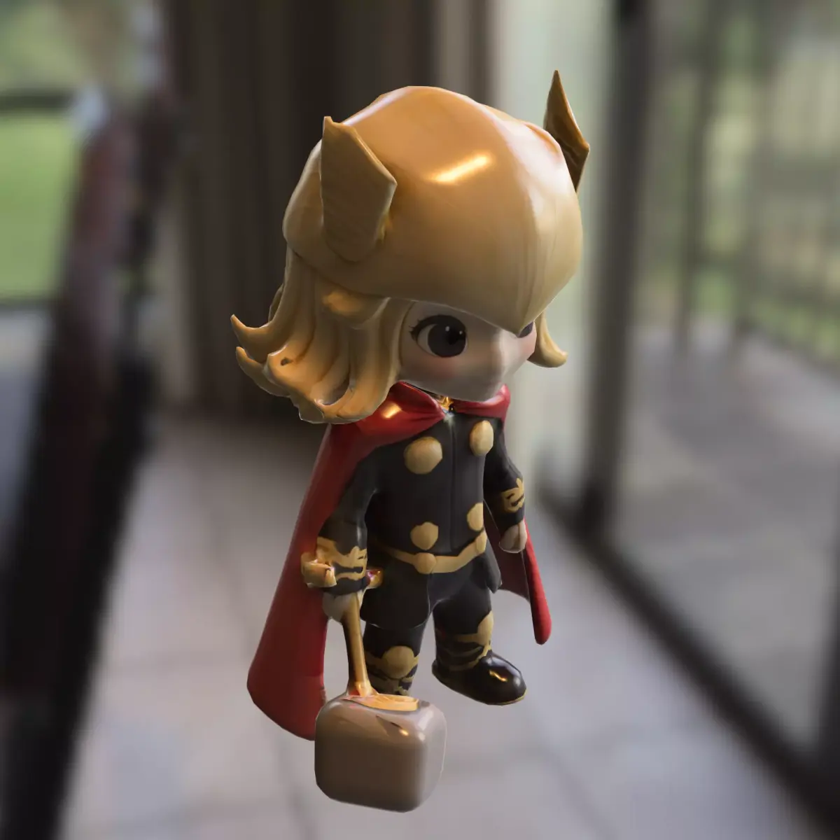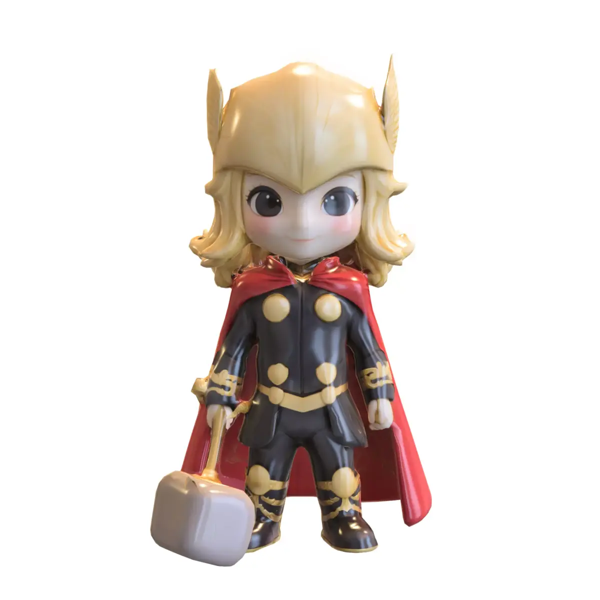 High-quality 3D model of a chibi-style thunder warrior wearing a golden winged helmet, black and gold armor, and a red cape, holding a detailed war hammer. Perfect for use as a playable character, NPC, or collectible asset in fantasy, RPG, and action-adventure games. Fully compatible with major game engines and optimized for performance.