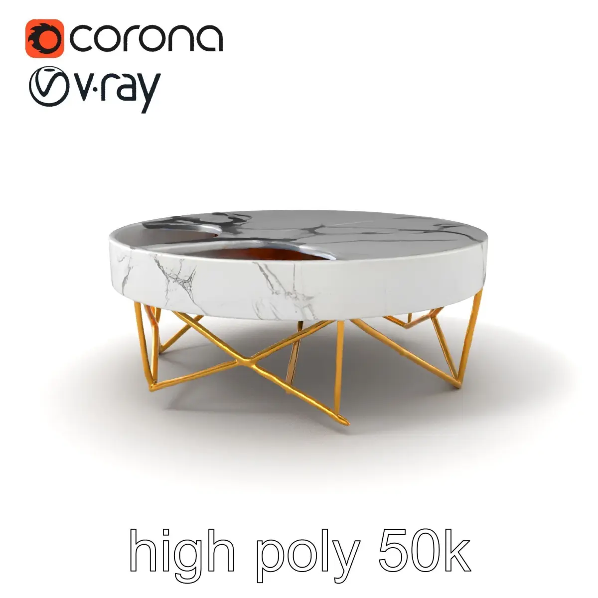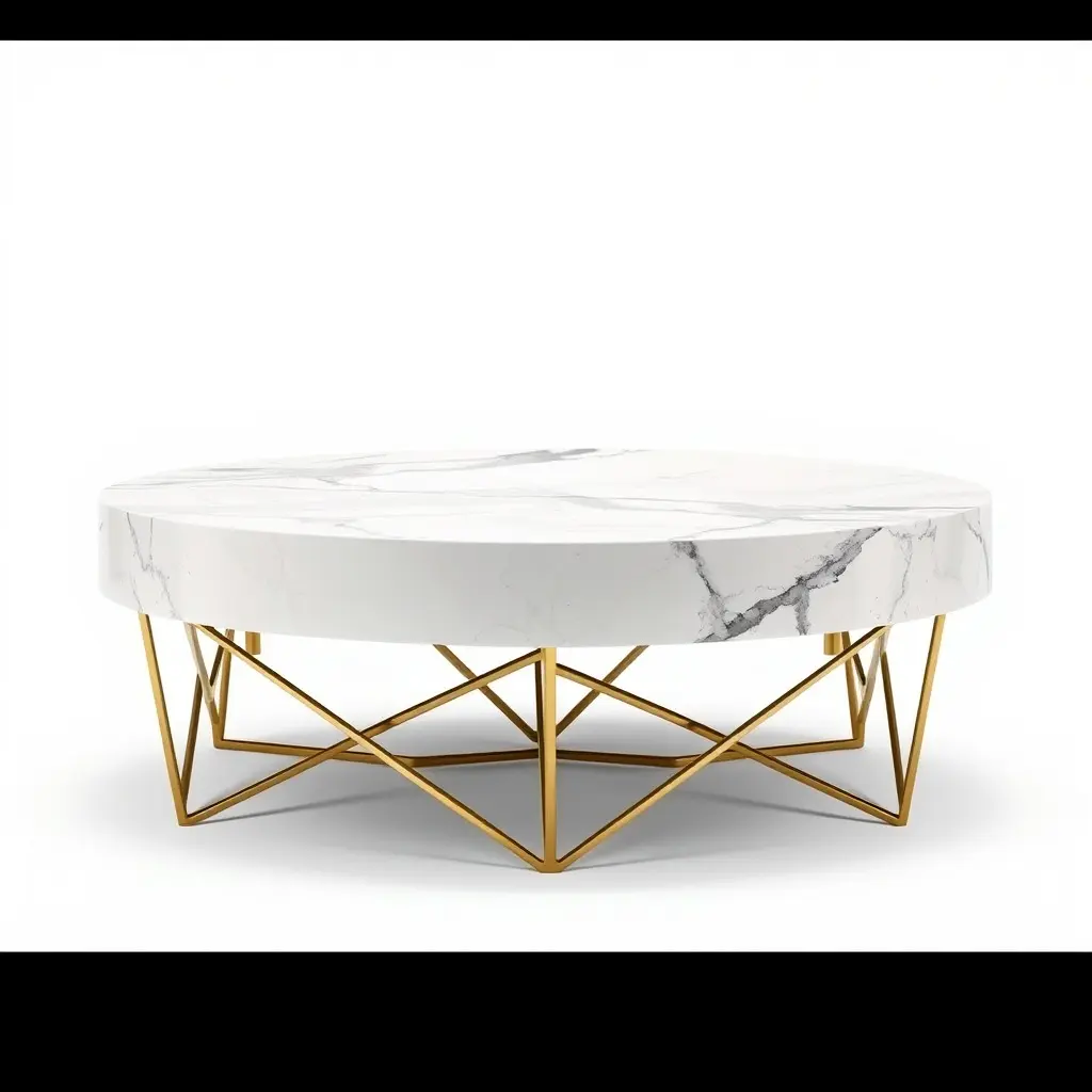 This chic marble coffee table with gold geometric legs is ideal for modern decor settings, including interior design visualizations and architectural presentations. Its elegant design suits minimalist and luxury aesthetics.