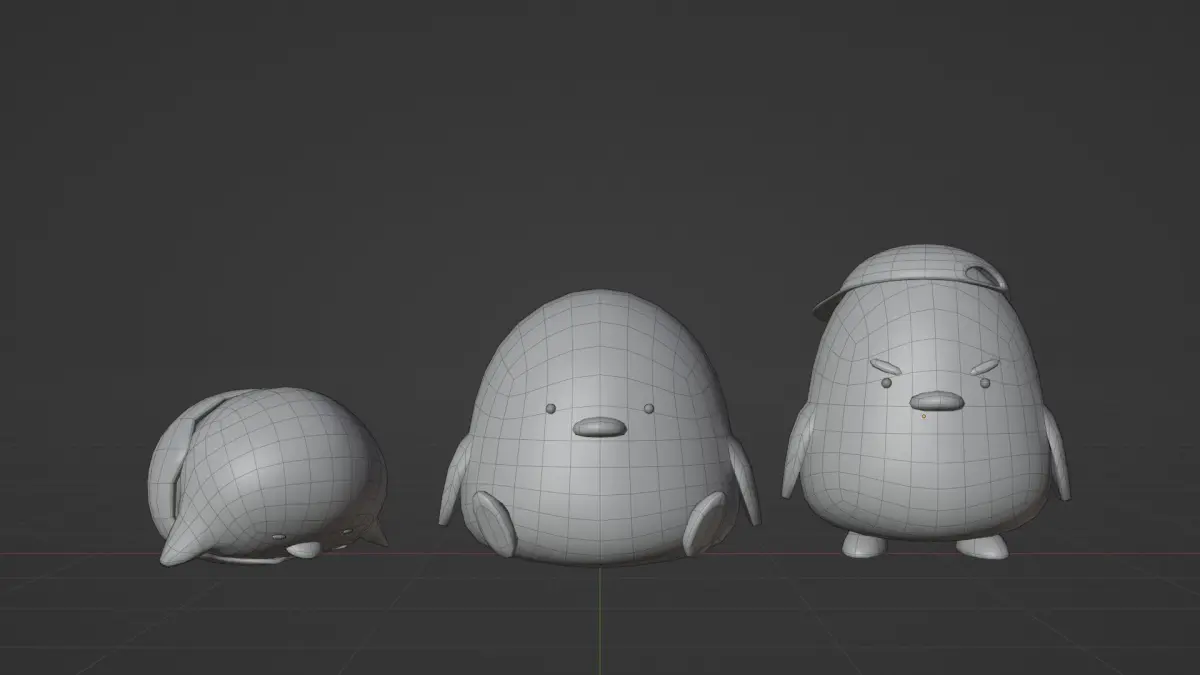 A cute 3d model of 3 little chicks. One is with an eggshell, another is an ordinary chick, and the last is the bully chick.