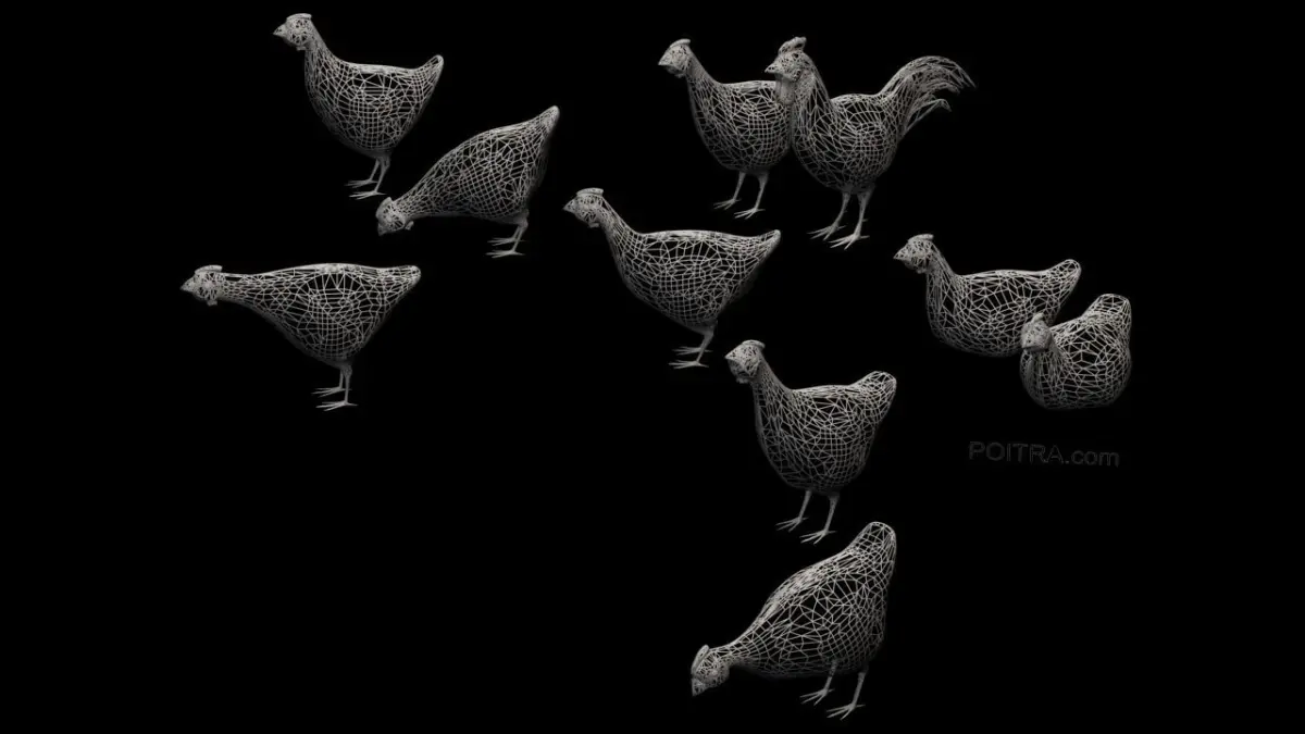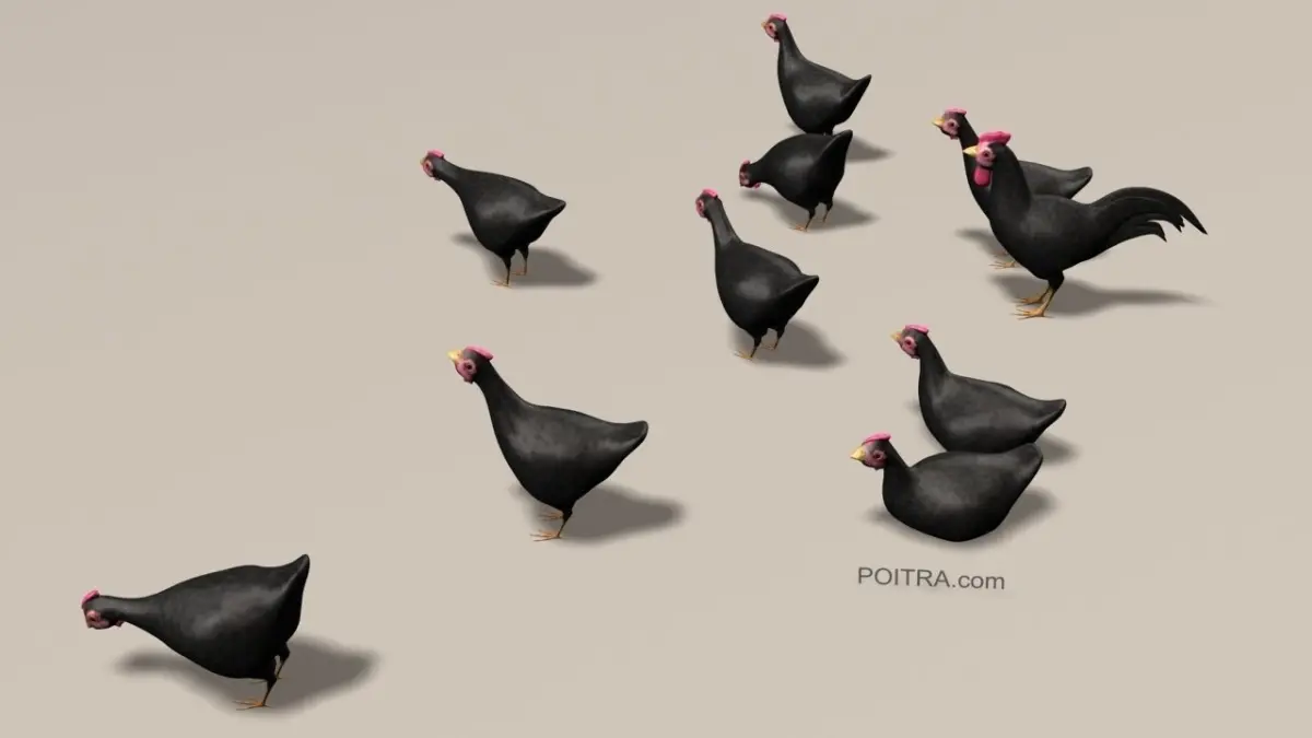 3D Model Chicken Ranch (Black) - this posed, texture mapped farm poultry collection includes 1 Rooster in a standing pose, and 9 Hens in standing, pecking and sitting poses (see details below). Each eye is an individual separate mesh. A White version of this chicken collection is also available (sold separately).