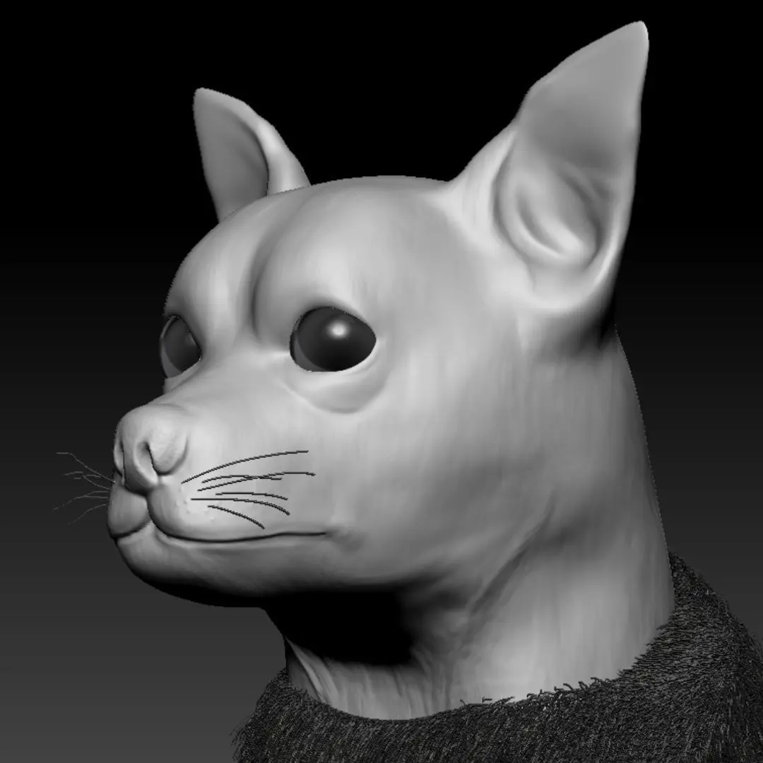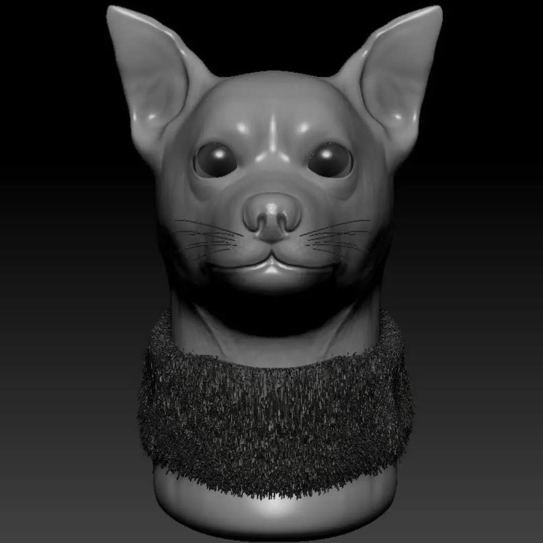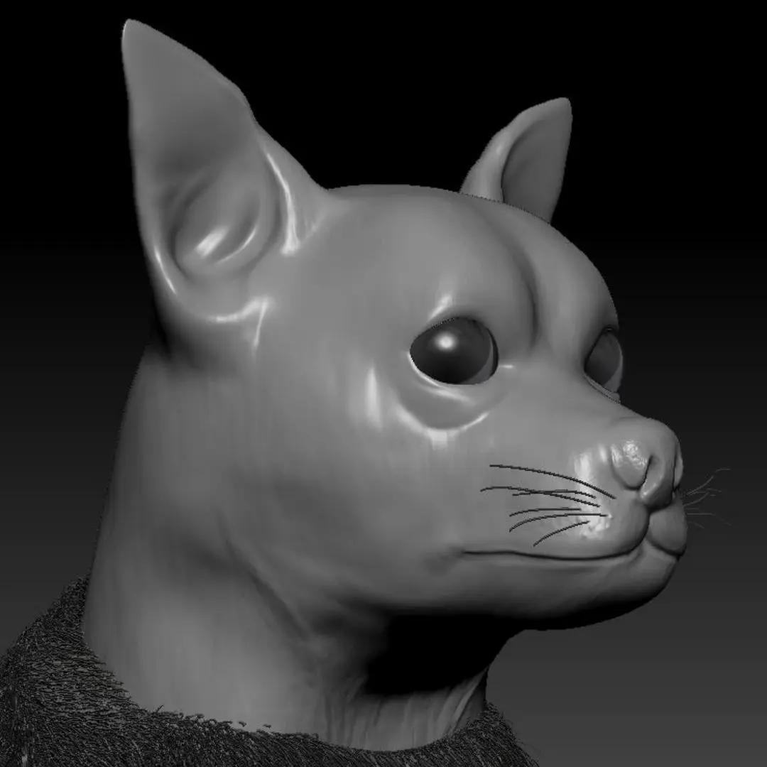 3D sculpture of the head of a chihuahua dog made in zbrush, with retopology made in maya. I share native zbrush file, retopology file in Maya, OBJ, FBX, Alembic,.dae and Stl format for printing. It contains 32,480 polygons and 32,546 vertices. I hope you enjoy it and get the best out of it!