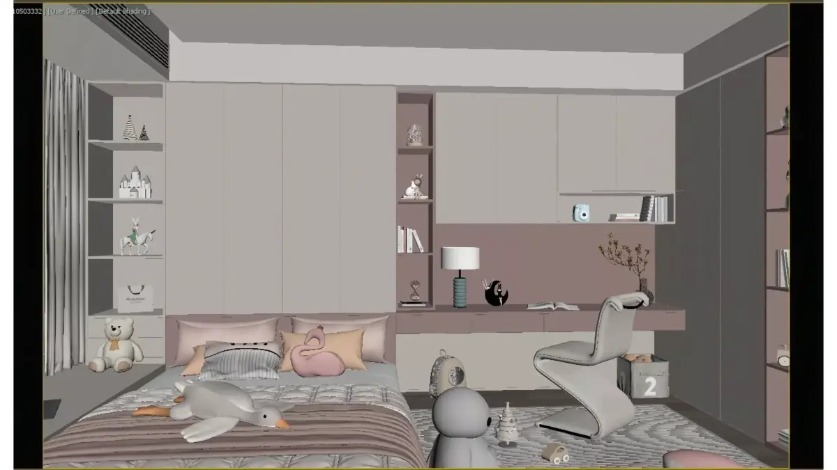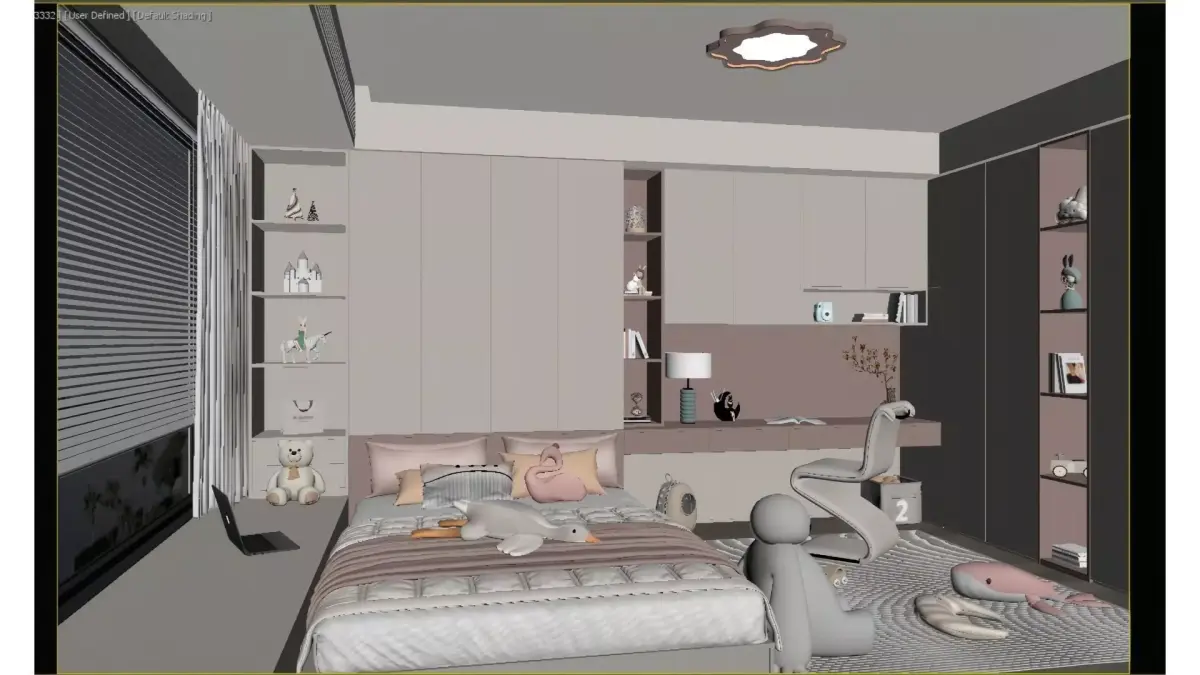This is a bedroom designed for girls and children, featuring a soft pink and pure off-white color palette with an overall modern minimalist cream style. The space integrates three core functions—sleeping, studying and storage—into a cohesive whole:The sleeping area is furnished with soft, skin-friendly bedding, paired with cute-shaped throw pillows and plush toys, creating an incredibly soothing and comforting rest atmosphere.The study area is seamlessly connected to custom storage cabinets, with a floating desk complemented by gentle ambient lighting that not only meets writing needs but also serves as a display space.The full-house custom cabinet system combines closed cabinet doors and open shelving: it ensures ample storage capacity, while warm under-shelf lighting showcases plush toys and books, blending practicality with aesthetic appeal in the space.A cloud-shaped ceiling light and large floor-to-ceiling windows flood the entire room with soft natural light, infusing it with childlike fun and warmth. This bedroom stands as an exemplary children’s space that balances visual beauty, functional utility and growing adaptability for kids.