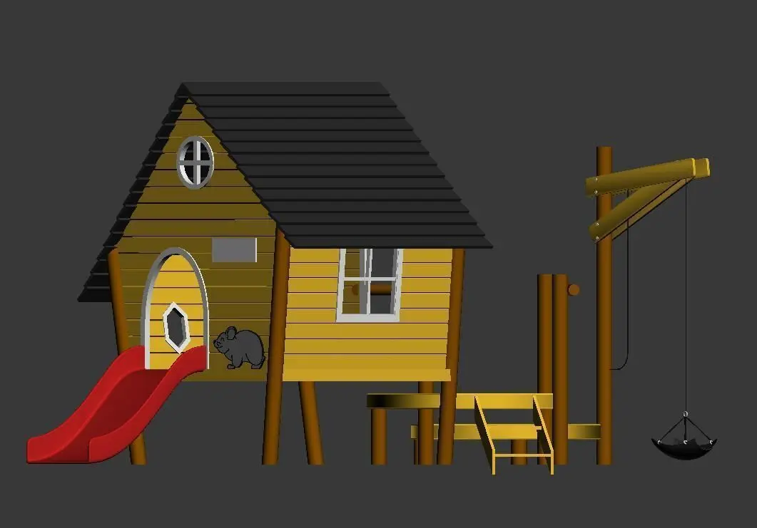 children basin wooden playhouse 3d model.This playhouse is put in the sand,and children in the sand can delivery the sand to the lifting plate,the children on the plstform will send the sand to the house .In the another side children could slide from the house.This playset could load 3-6 kids to play at the same time