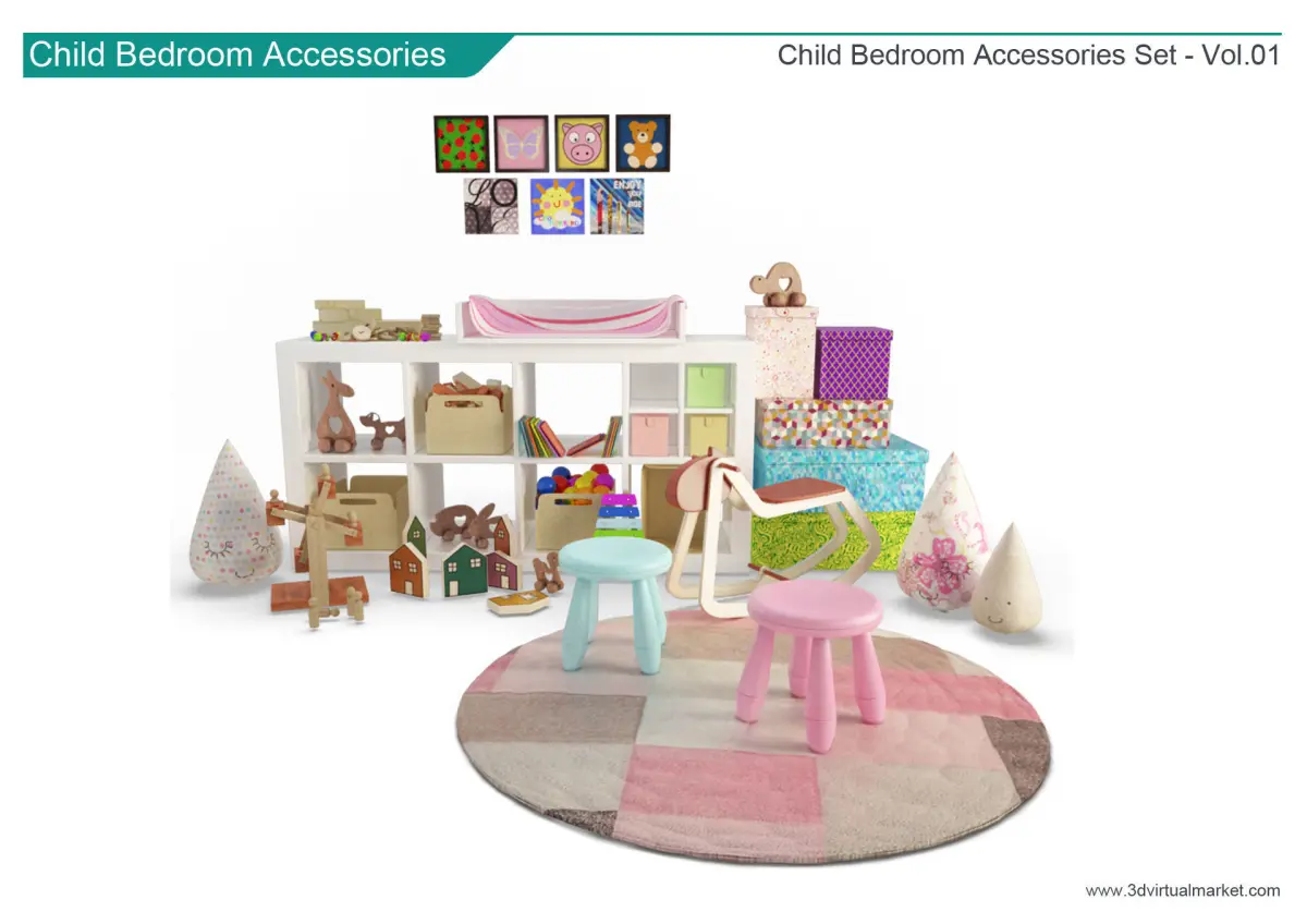Games, plushes and cushions, furniture, books, and decoration children selection for a funny space.