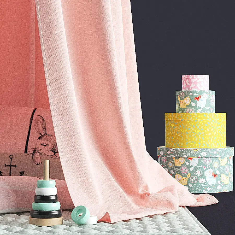High quality 3d models of a children canopy in scandinavian design with canopy, soft fabric floor mat, some pillows, decorative boxes and some small nice looking wall/roof hanged skies. Looks great in bedroom renders, you can even add a sphere light into the tent and the fabric material in the tent will light up and look very cosy. This set is made carefully after references and it is mapped and textured with all maps included and ready to render. It comes in many formats.