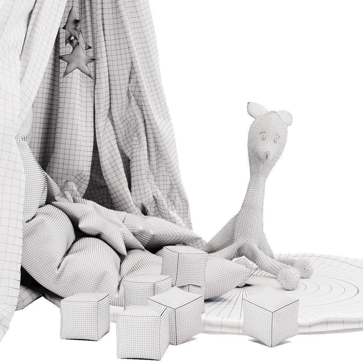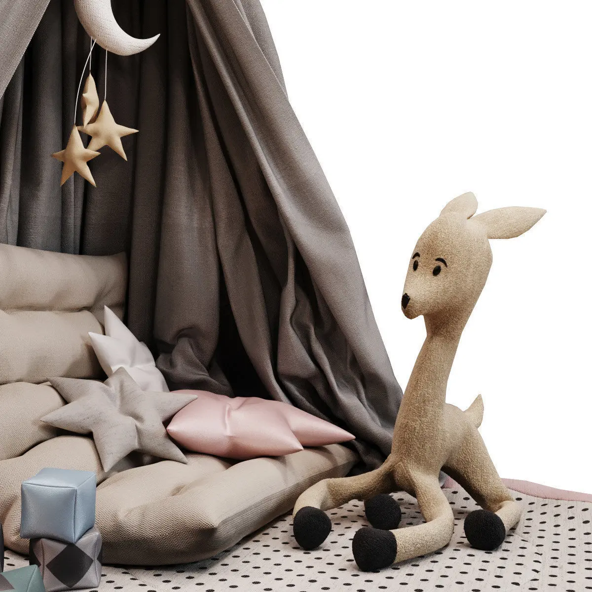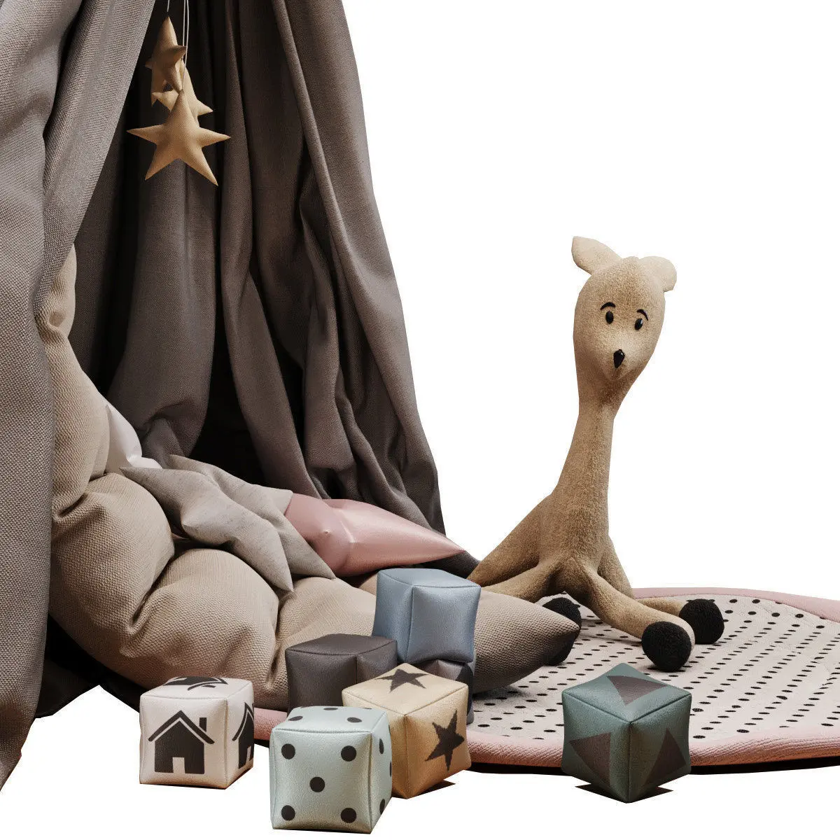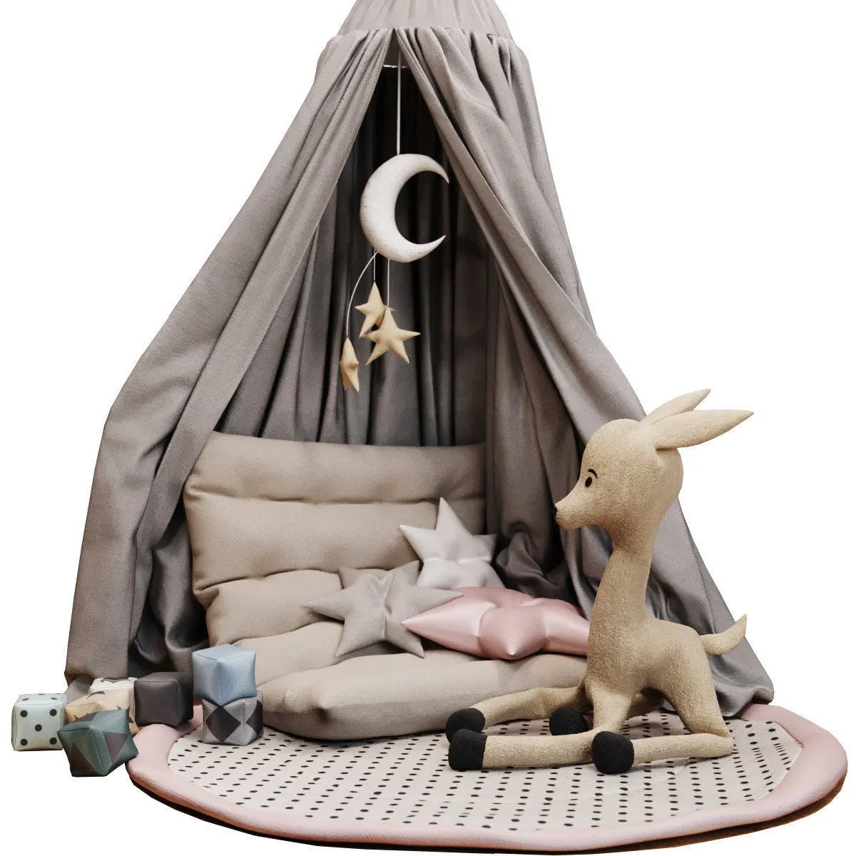- В модели все, что на превью ( кубики, вигвам, подушки, олень, подвесы, ковер )