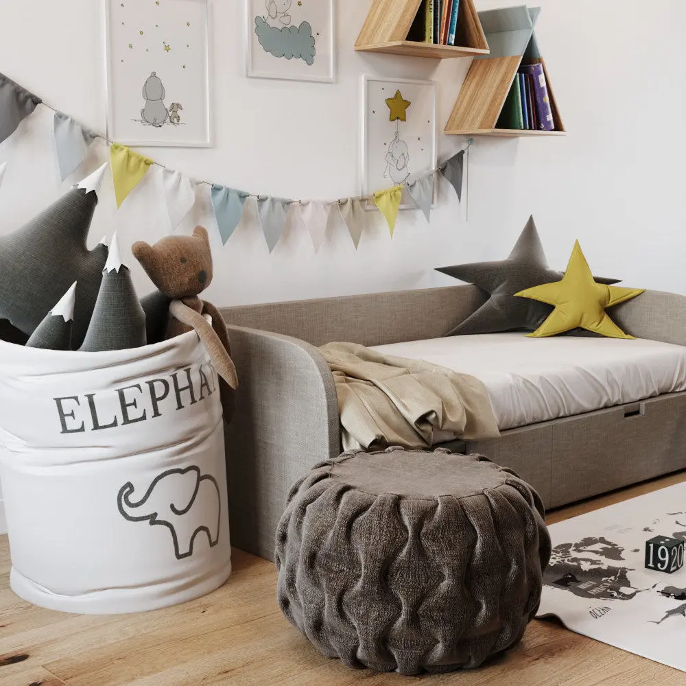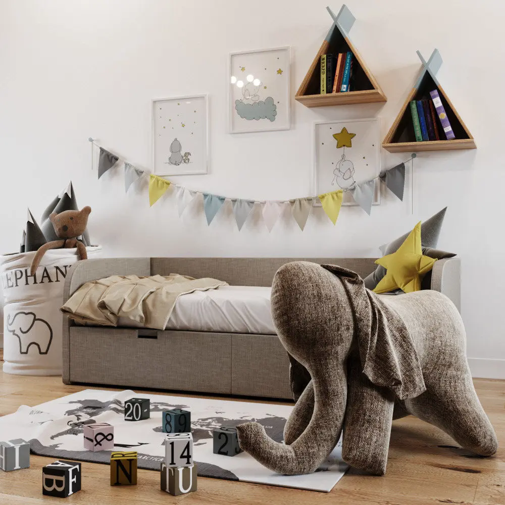 В файле присутствует все, что есть на превью.Размер кровати: 1900*890*650ммПаркет: https://adv-parket.ru/catalog/parketnaya_doska/barlinek/dub-joy-senses.html Ковер: Cotton Rug with Printed Motif http://www2.hm.com/en_us/productpage.0634623001.html Постеры можно купить по ссылке: https://www.etsy.com/listing/162153069/elephant-nursery-art-print-nursery-decor