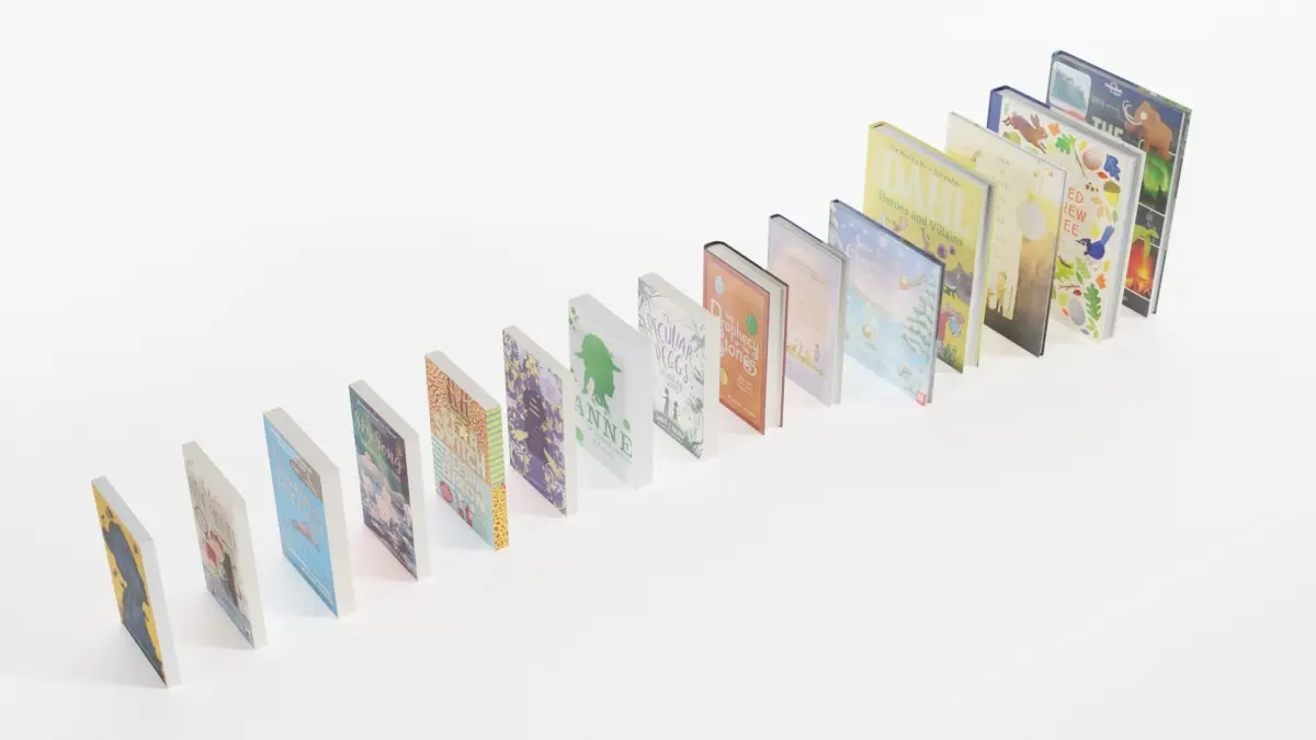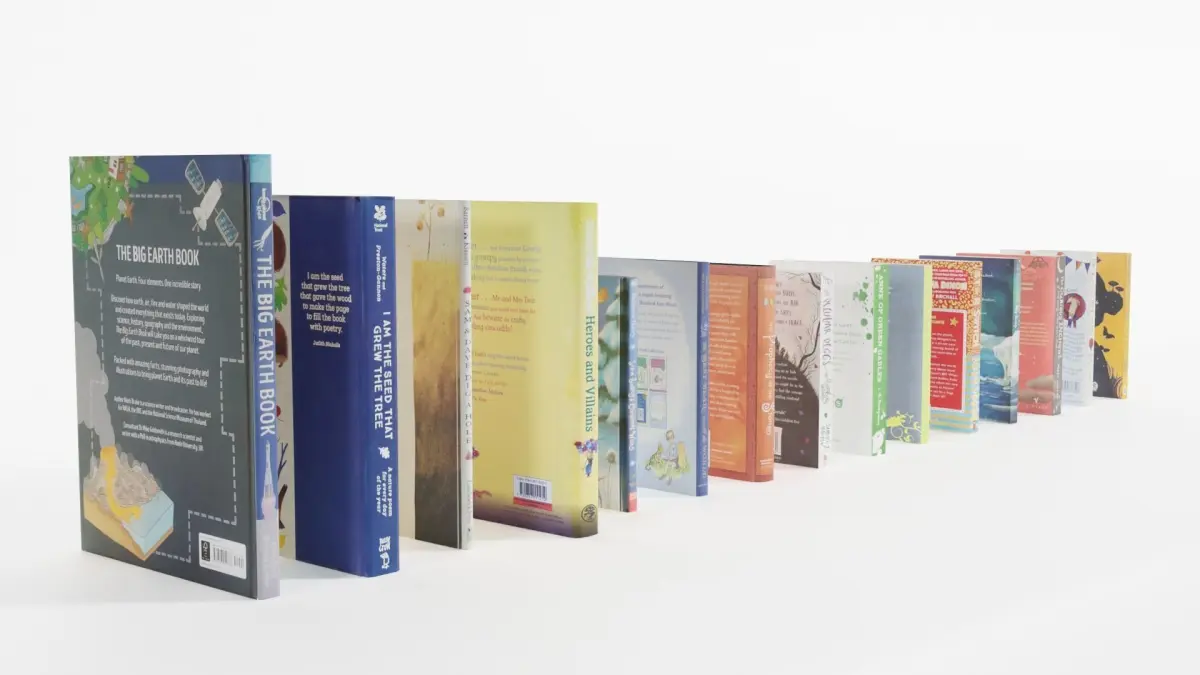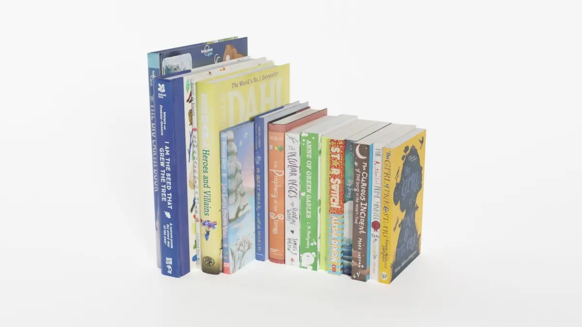 The models (15 in total) have real world scale. Each book is a seperate object (except, in the .ply-file they are joined together), but they are all grouped. The bottom of the objects is on the same level. The first three images show, how they are presented in the file (between each origin point lie 0.1 units).