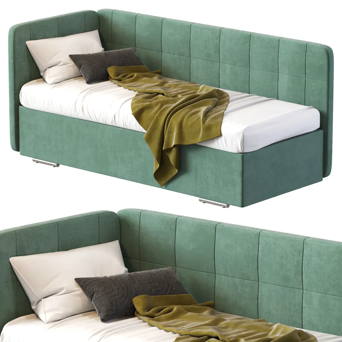 The bed can be equipped with a base with slats or a lifting mechanism and a linen box.