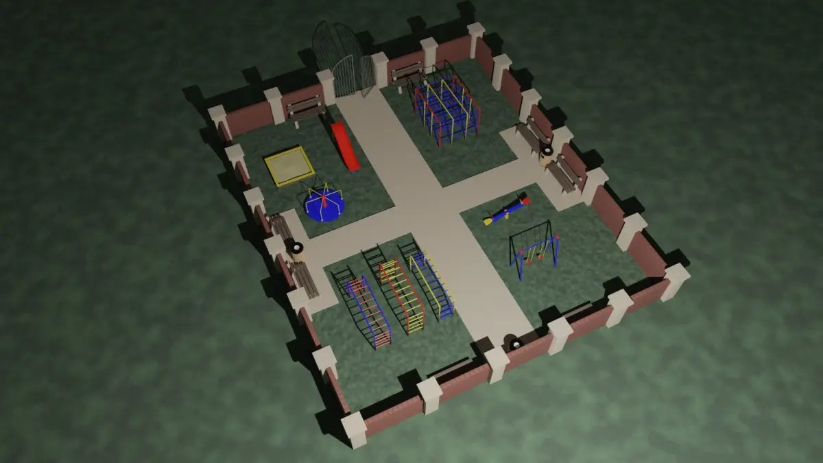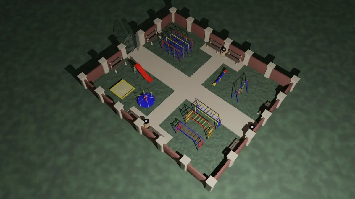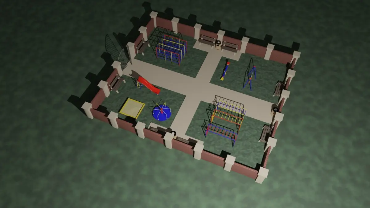 A childrens park with a playground. All the toys are made out of painted metal, the colors are blue, red and yellow. It has a brick wall with collumns surrounding it and a metal enterance which can be easily opened or closed. It also has a couple of benches and trash chans.The model is made in Blender 3.0 and rendered in Cycles.