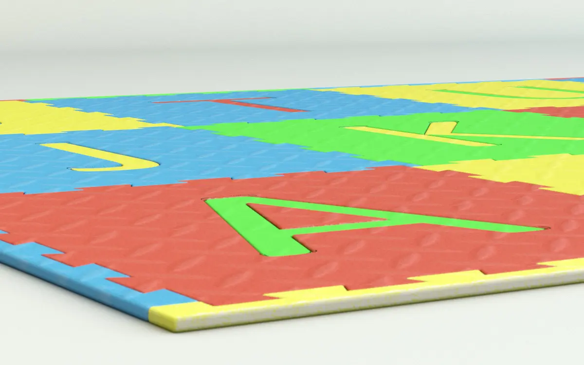 Soft foam floor tiles, cut so that squares clip together for any size floor. Side trim pieces gives a smooth edge around the central squares.Squares and cut-outs are induvidually modeled for maximum adaptablility.