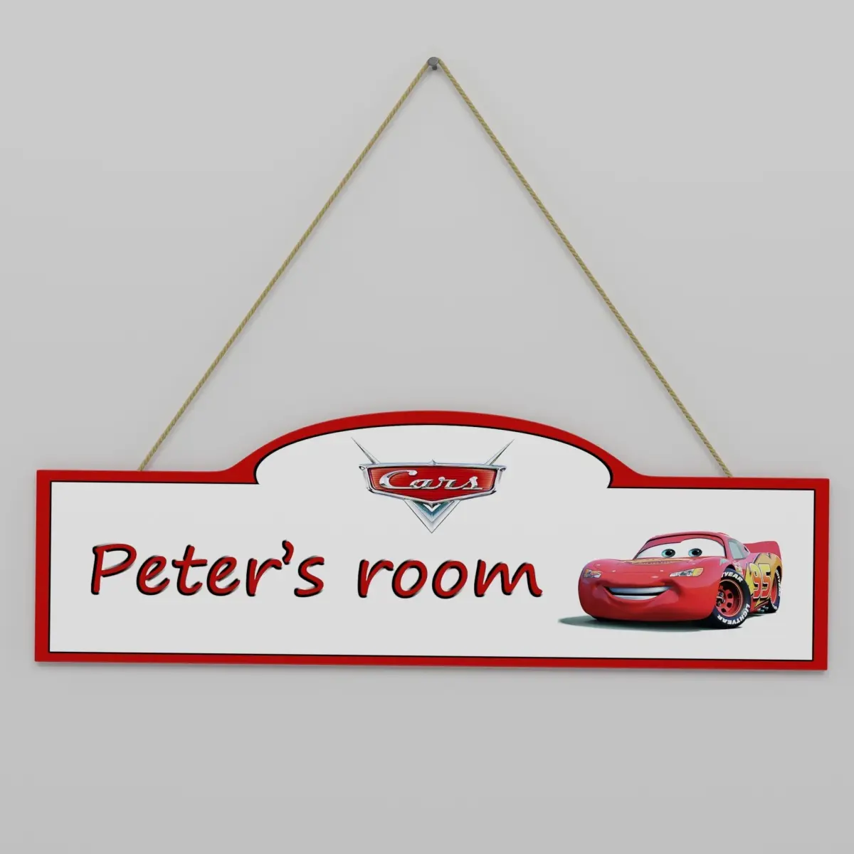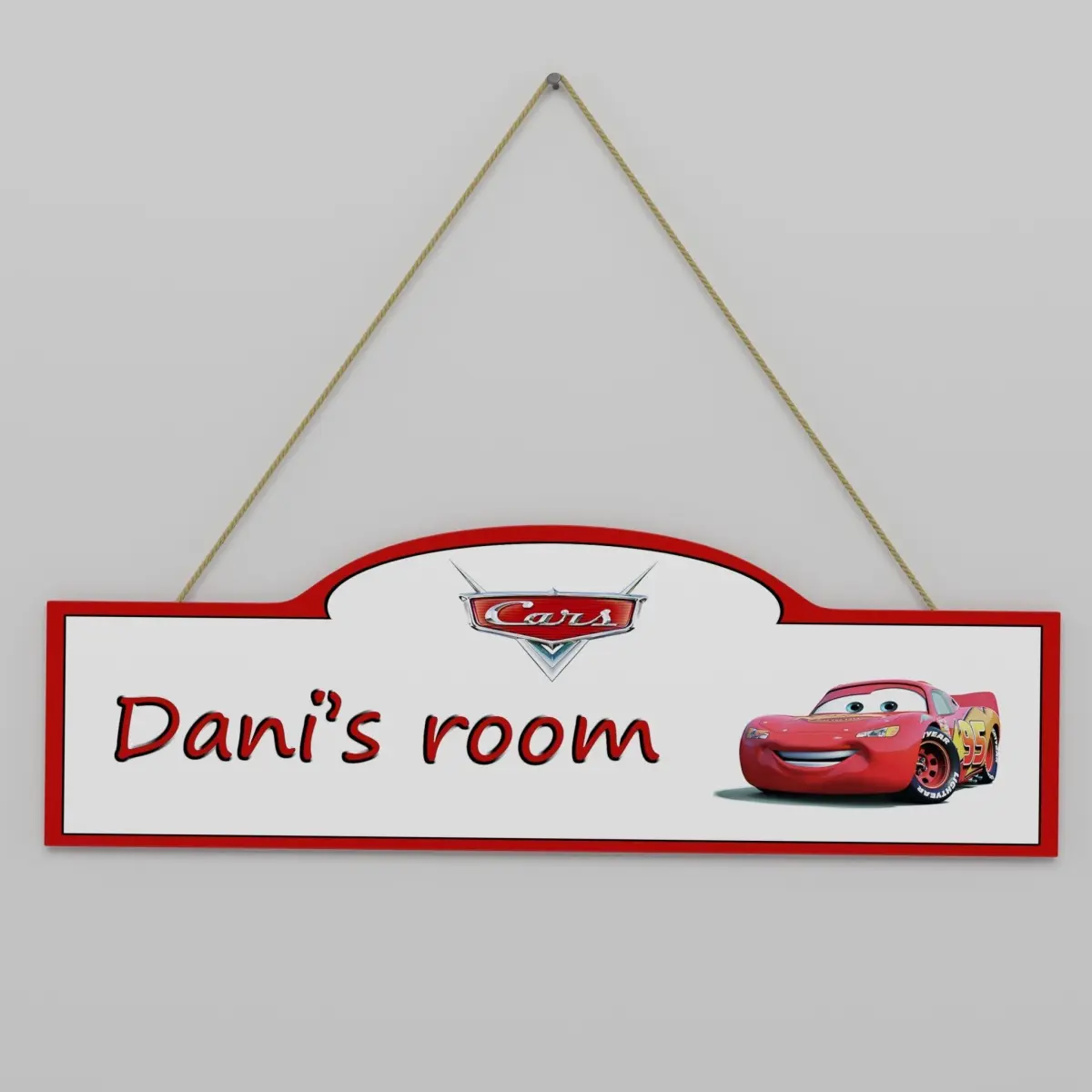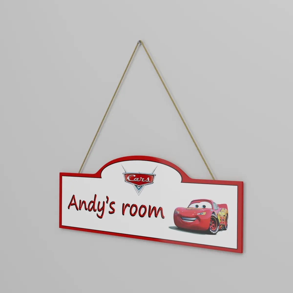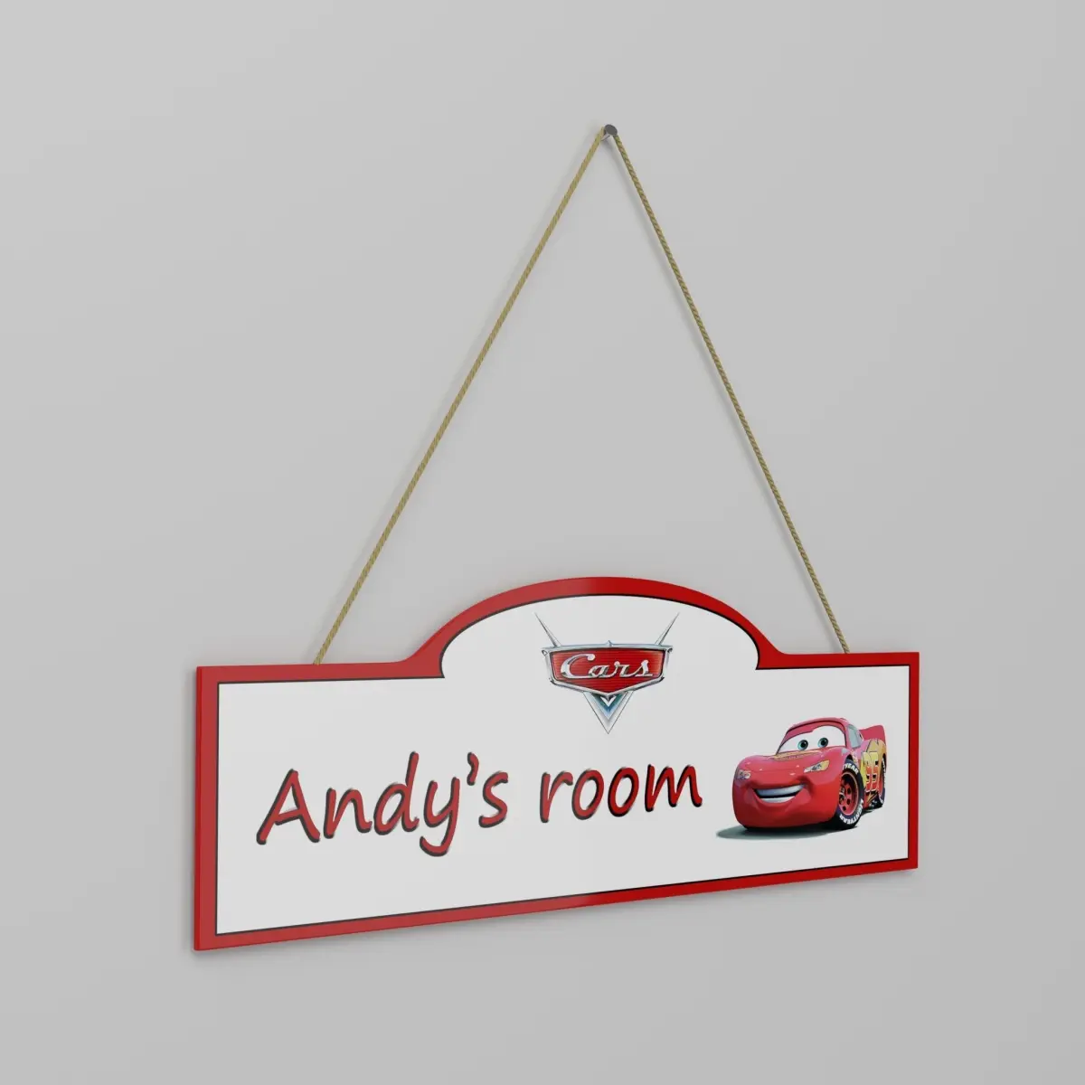3D Model of a children's room sign with Cars theme. A high-quality model with nice details. Complete with materials and textures. All parts have been named and organized in a layer. The Photoshop file is included for changing the name and/or theme. The rope has a displacement map. Stickers can always be removed to avoid copyright issues.