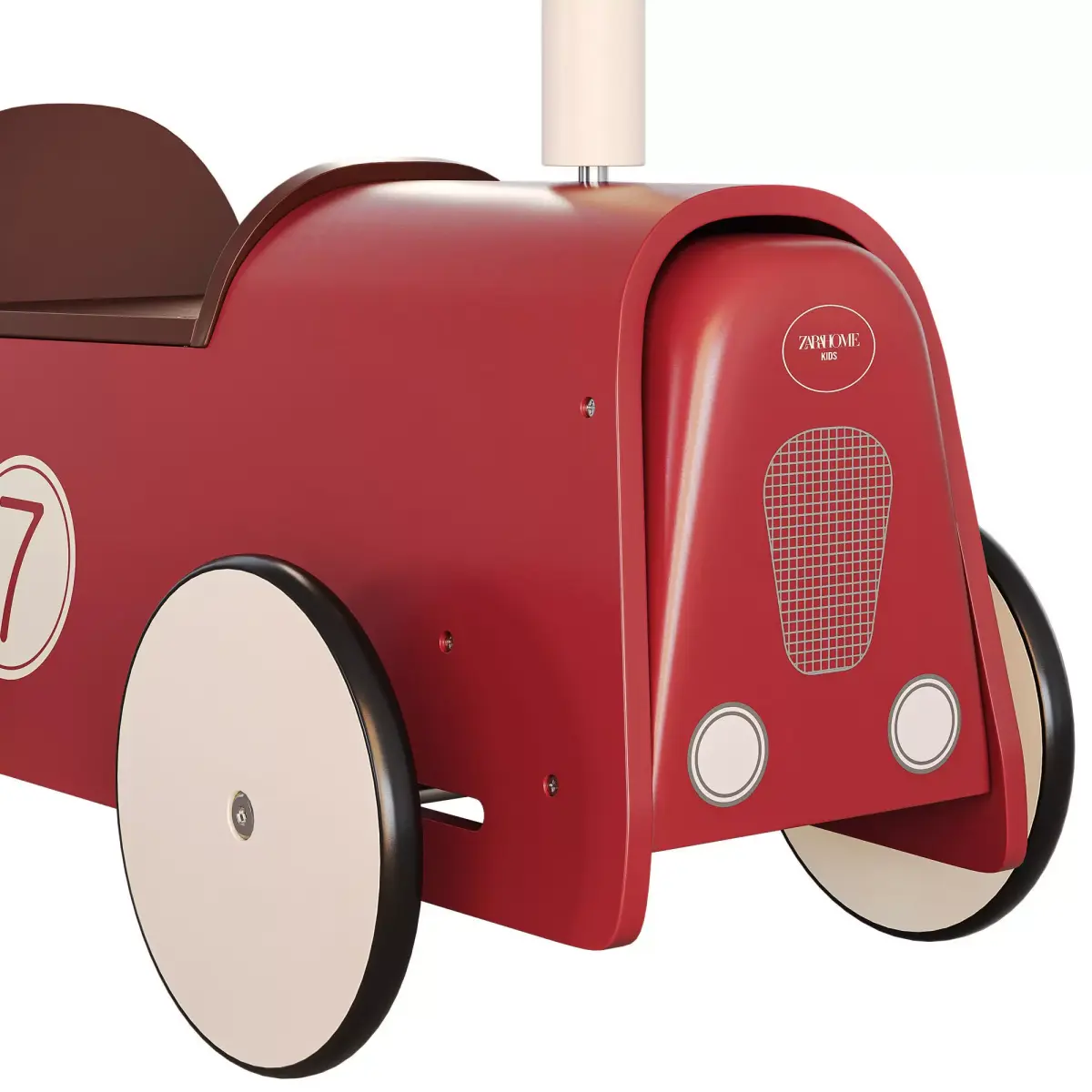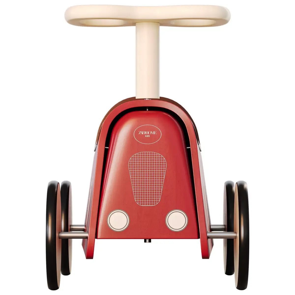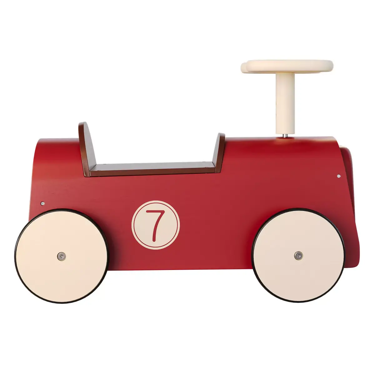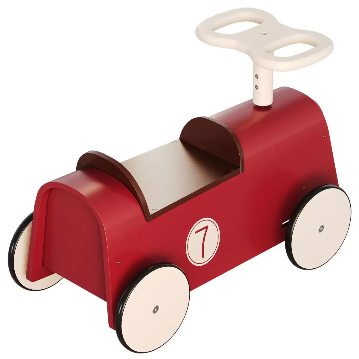 Wooden ride-on toy car with rubber wheels and steering wheel.