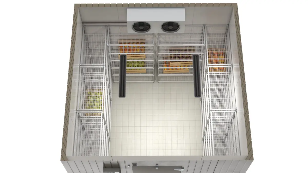Chilled Fruit Holding Chamber White is a three-dimensional model of cold storage module with a secure door and a control panel, that is an insulated refrigeration room used for preserving perishable goods in industrial settings.