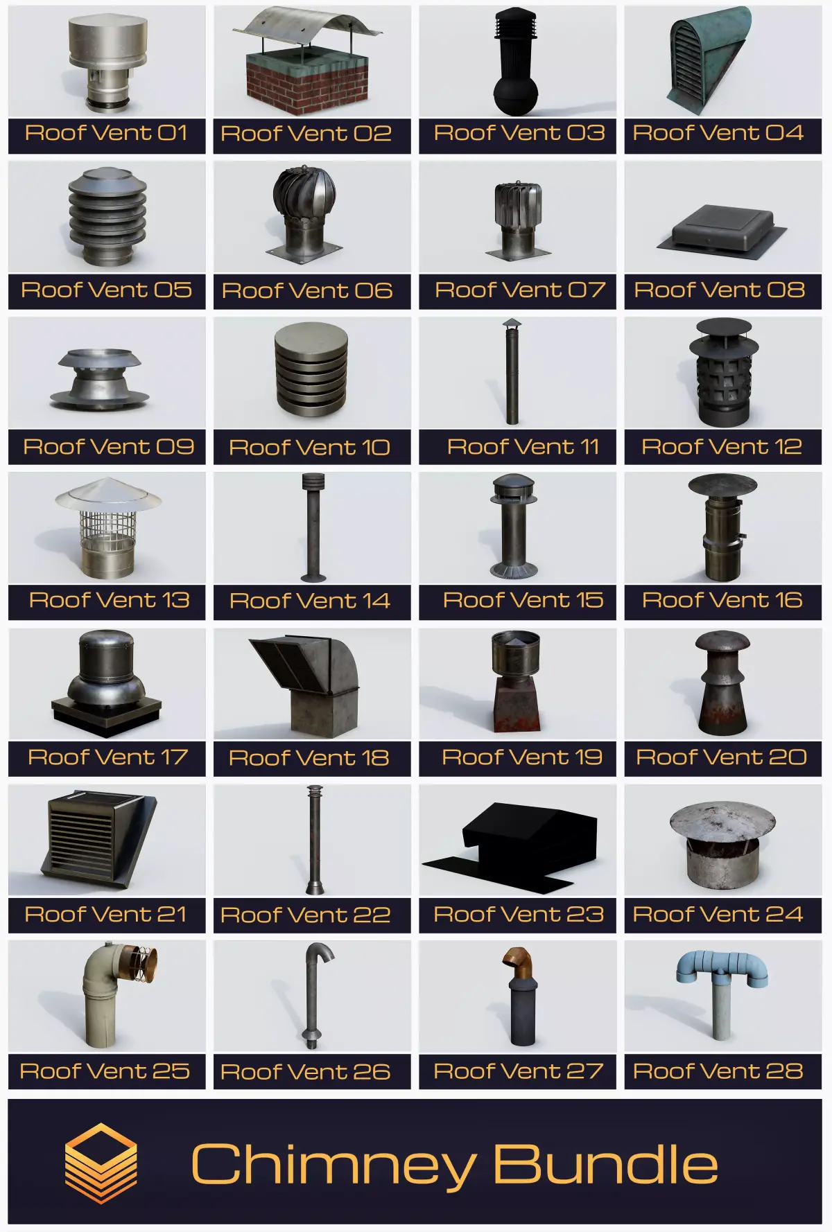 A professional industrial collection of 28 hyper-realistic chimney assets, including various industrial smokestacks and factory chimneys designed for industrial zones, power plants, factories, and heavy production environments.