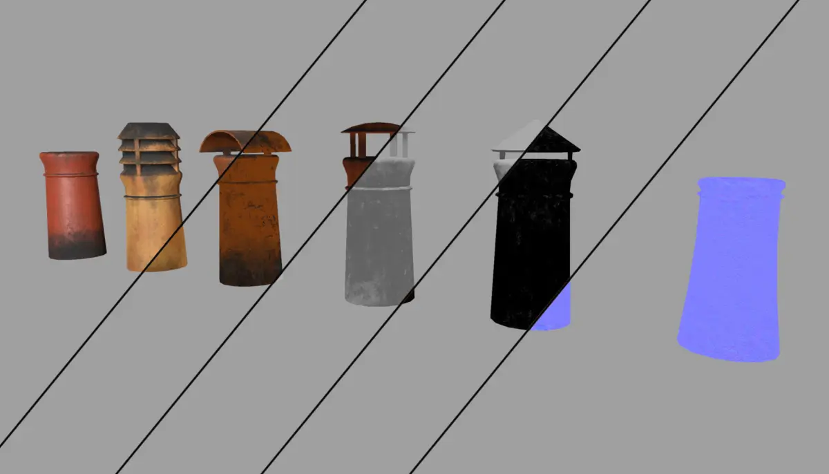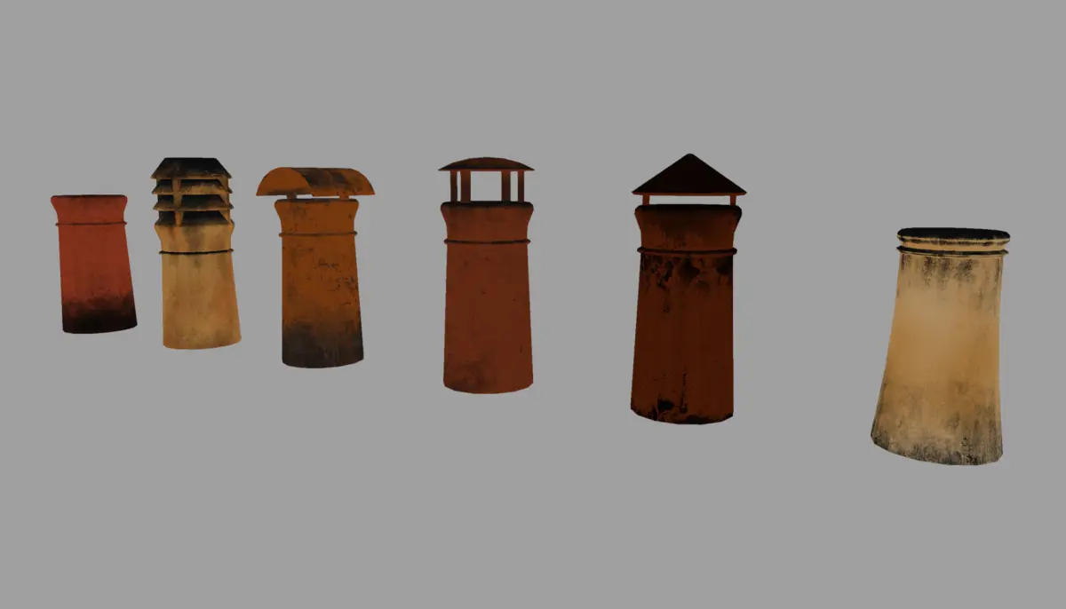 6 PBR Textured London lowpoly chimney pipes4k Textures336-1084 polys182-580 vertsThese chimney pipes are an extract from London Street environment I made for Unreal Engine 4. Available in FBX, OBJ, 3DS formats.For the full project for the engine click here: https://www.cgtrader.com/3d-models/architectural/street/london-street-environment-unreal-engine-4Textured in Quixel Suite 2
