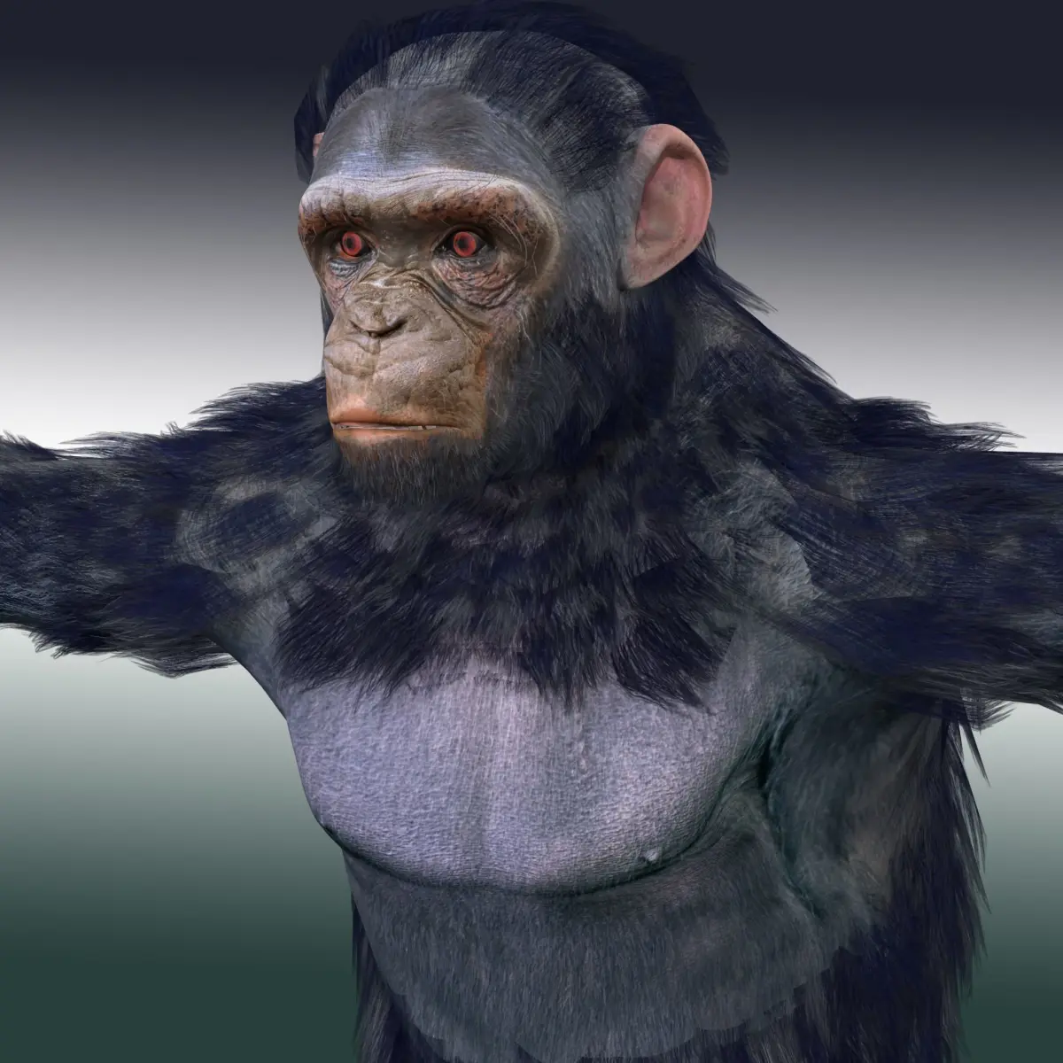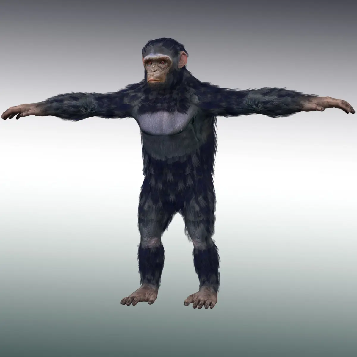 Chimpanzee Detailed model with texturing Fully Rig Model, UV unwrapped, textured with edited materials, Character can be scaled up or down to merge into your scene. No special plugin needed to open scene. All colors can be easily modified. Model Format - 3DS MAX - 2018 Autodesk maya - 2018