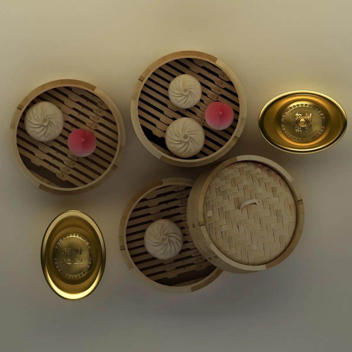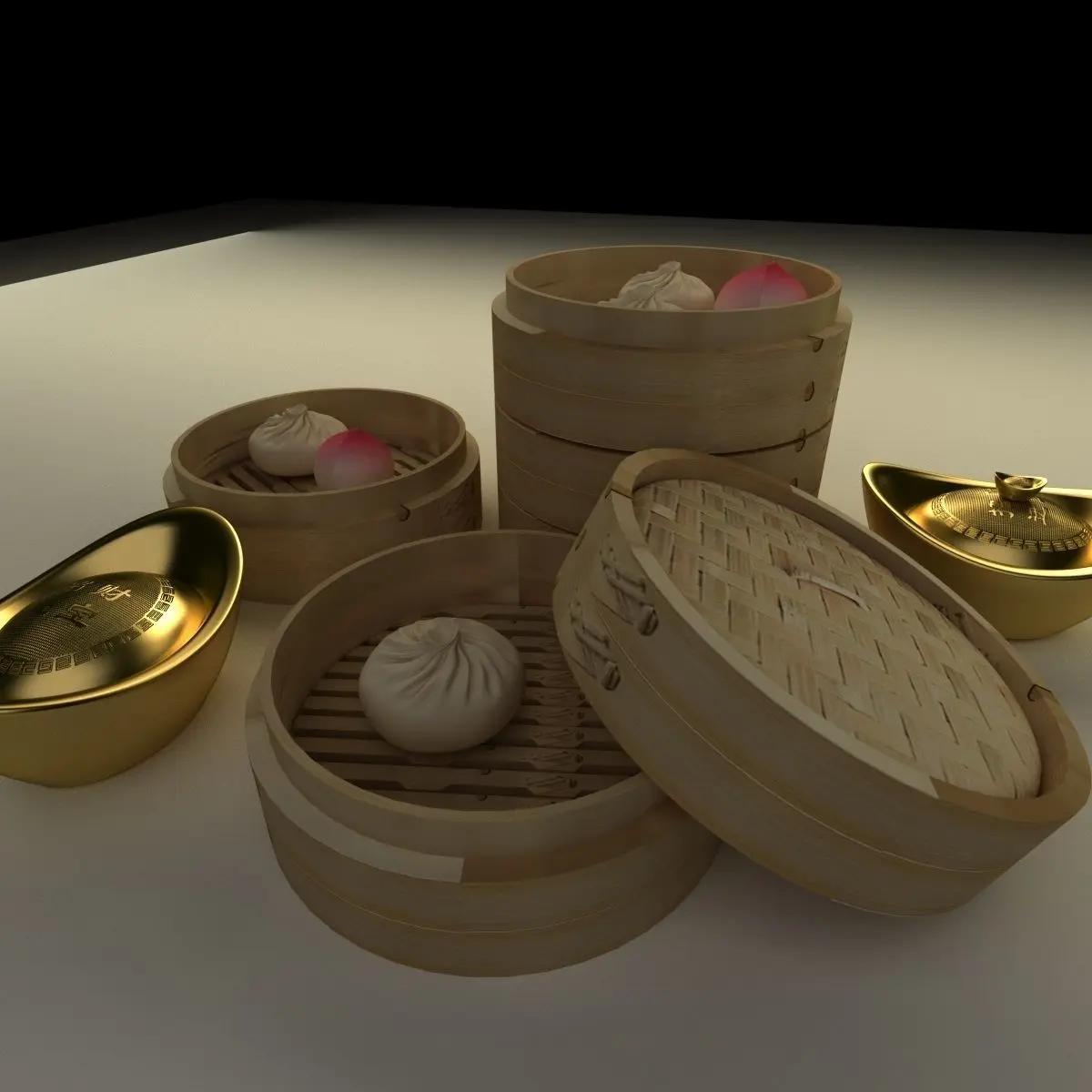 Chinese gold Ingot(Yuan Bao) and bamboo steamer 3D models created in 3D Max.(.max,.obj,.stl) . All scene and texture map are included in Zip file. All scene are rendered by VRay.Available files: chinese_gold_ingot_bamboo_steamerA.rar