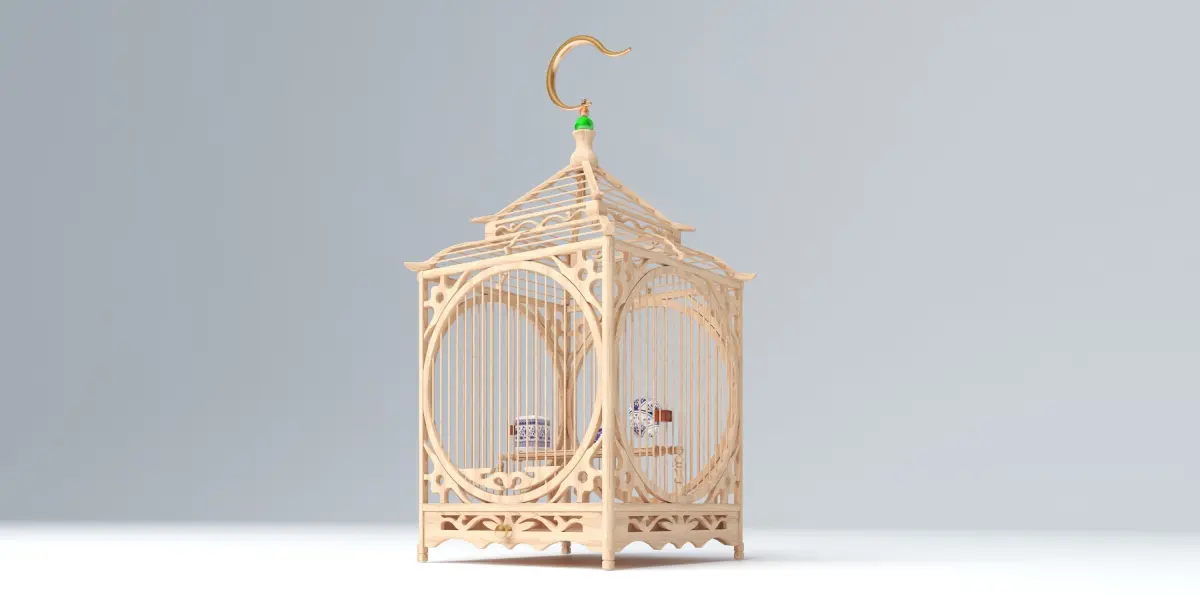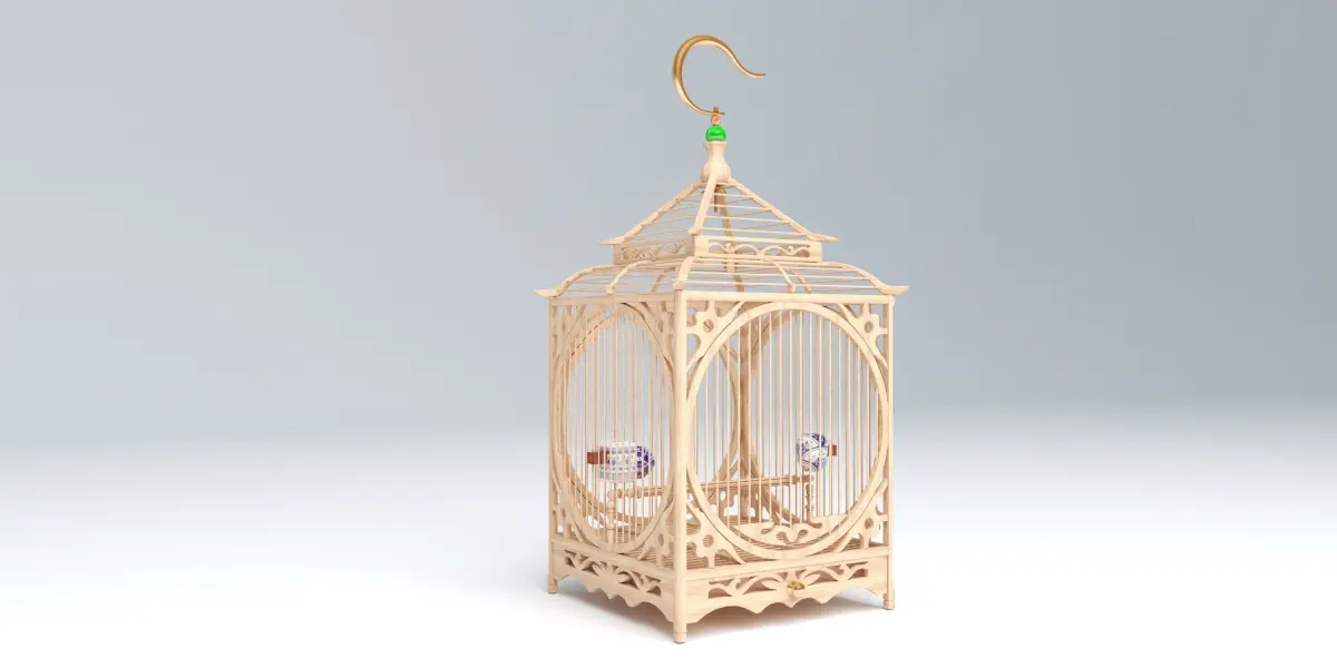 Chinese large bamboo and wooden bird cage, of classic form, together with three turquoise hue bird feeders