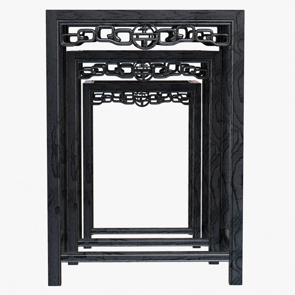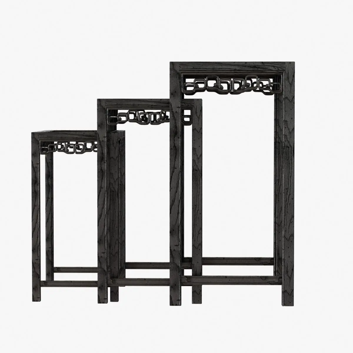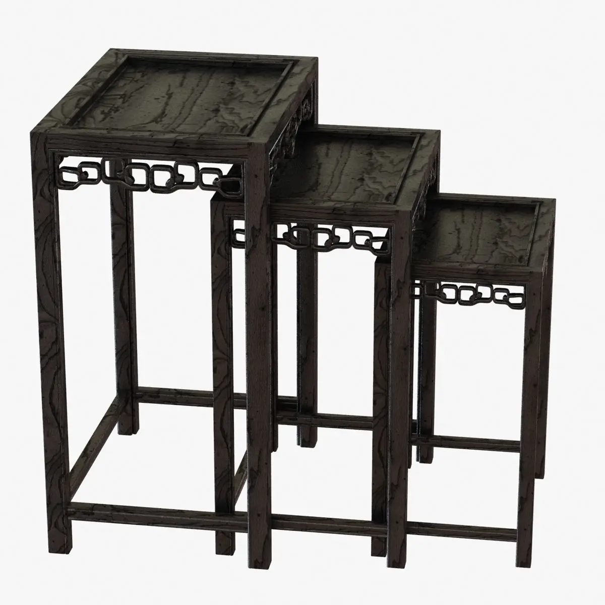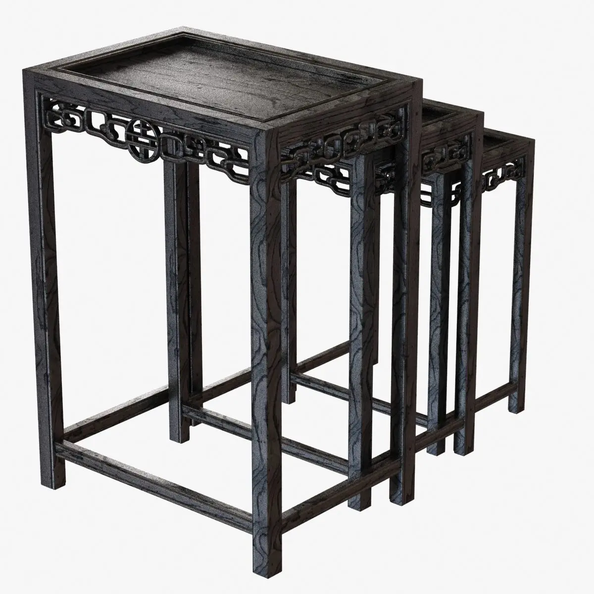 Chinese Black Lacquered Nest of Three Side TablesChinacirca 1900Chinese nest of side tables, carved of hard wood with a rich black lacquer finish with reddish undertones. The three tables fit together, circa 1900.