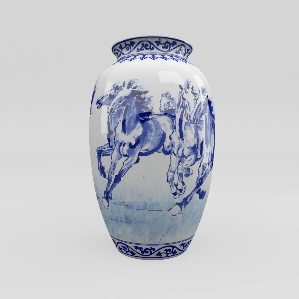 Chinese blue and white porcelain vase with horses painting. Suitable for interior scenes, animation, games or any real time applications. The asset is detailed enough to allow close up shots.