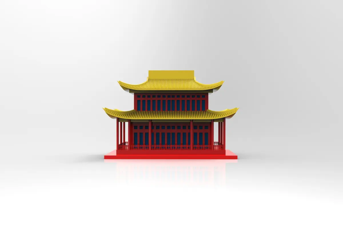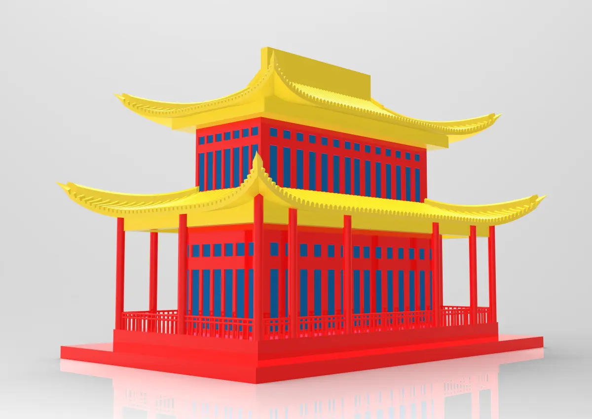 3D model of a Chinese building, include features such as sloping roofs with overhanging eaves.The elegance and beauty of traditional Chinese architecture, with intricate details and unique features that reflect the cultural heritage of China.