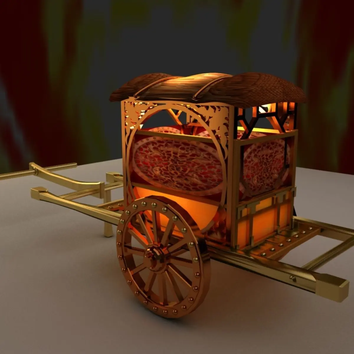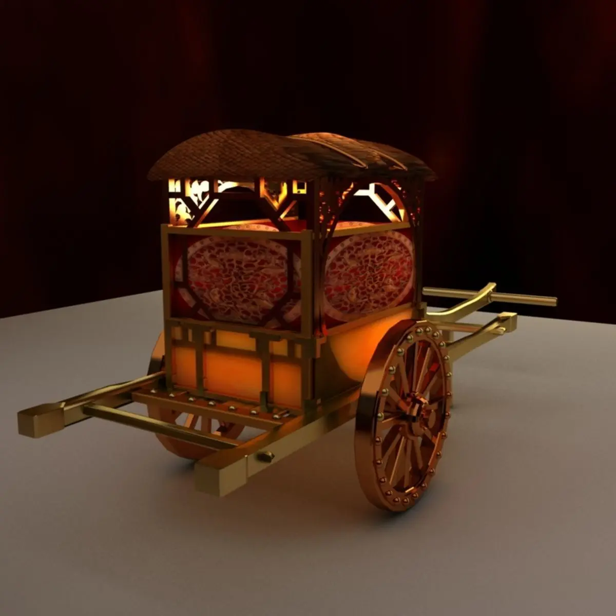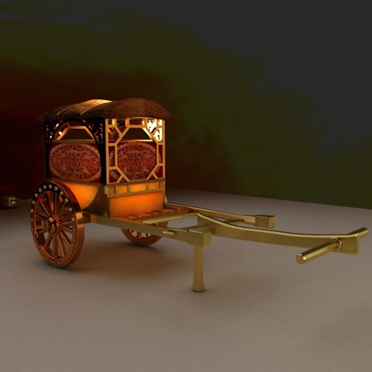 Chinese carriage 3D model created in 3D Max.(.max,.obj) . All scene and texture map are included in Zip file. Final images rendered with Vray.Available files: chinese_carriageB.rarSteroLithoGraphy(.STL) 3D printer format ready3D Maxwavefront(.OBJ)Image file(.jpg)Polygons:78082Vertices:64913VRay version:3.60.03