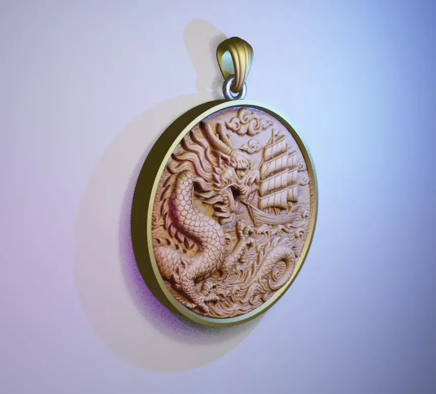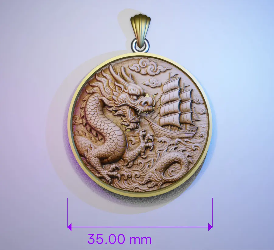 Unleash the power and elegance of Eastern mythology with this highly detailed Chinese Dragon Coin Relief Pendant. This captivating design features a fierce Chinese dragon coiled in the clouds above ocean waves, locked in a dynamic scene with a traditional sailing ship — symbolizing strength, protection, and prosperity.