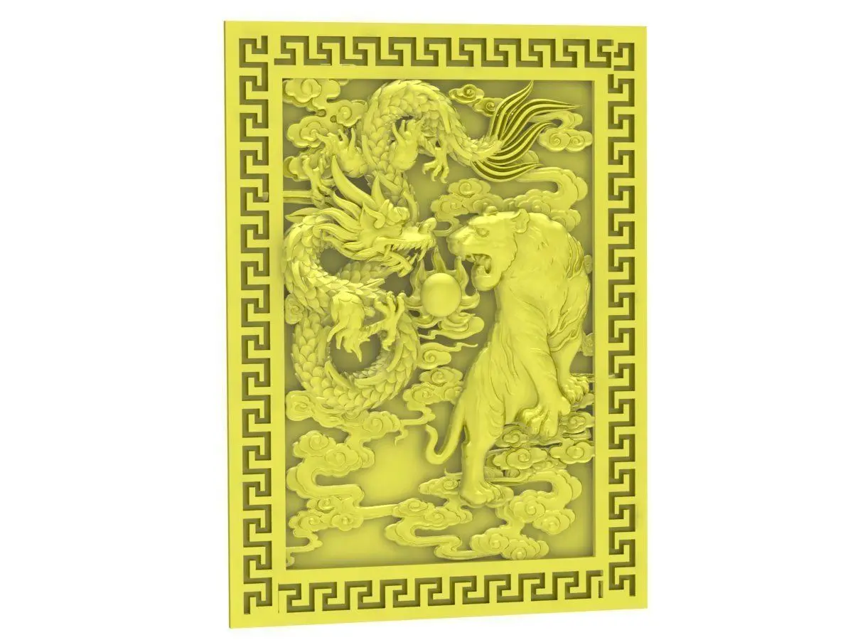 This 3D model features a highly detailed Chinese dragon relief panel framed with a classic Greek key border. The design is created in high-resolution CAD format, providing clean surfaces and precise depth suitable for jewelry applications, metal plates, decorative plaques, or CNC carving projects. The dragon is sculpted with intricate scales, flowing movement, and strong dimensional contrast to create an impressive visual impact.