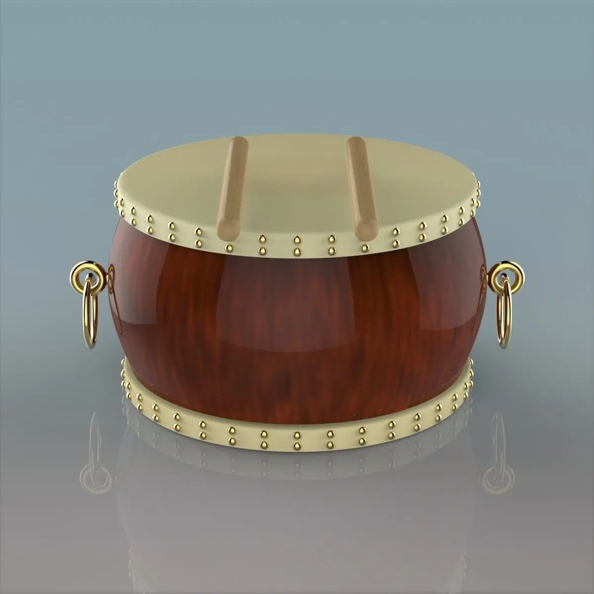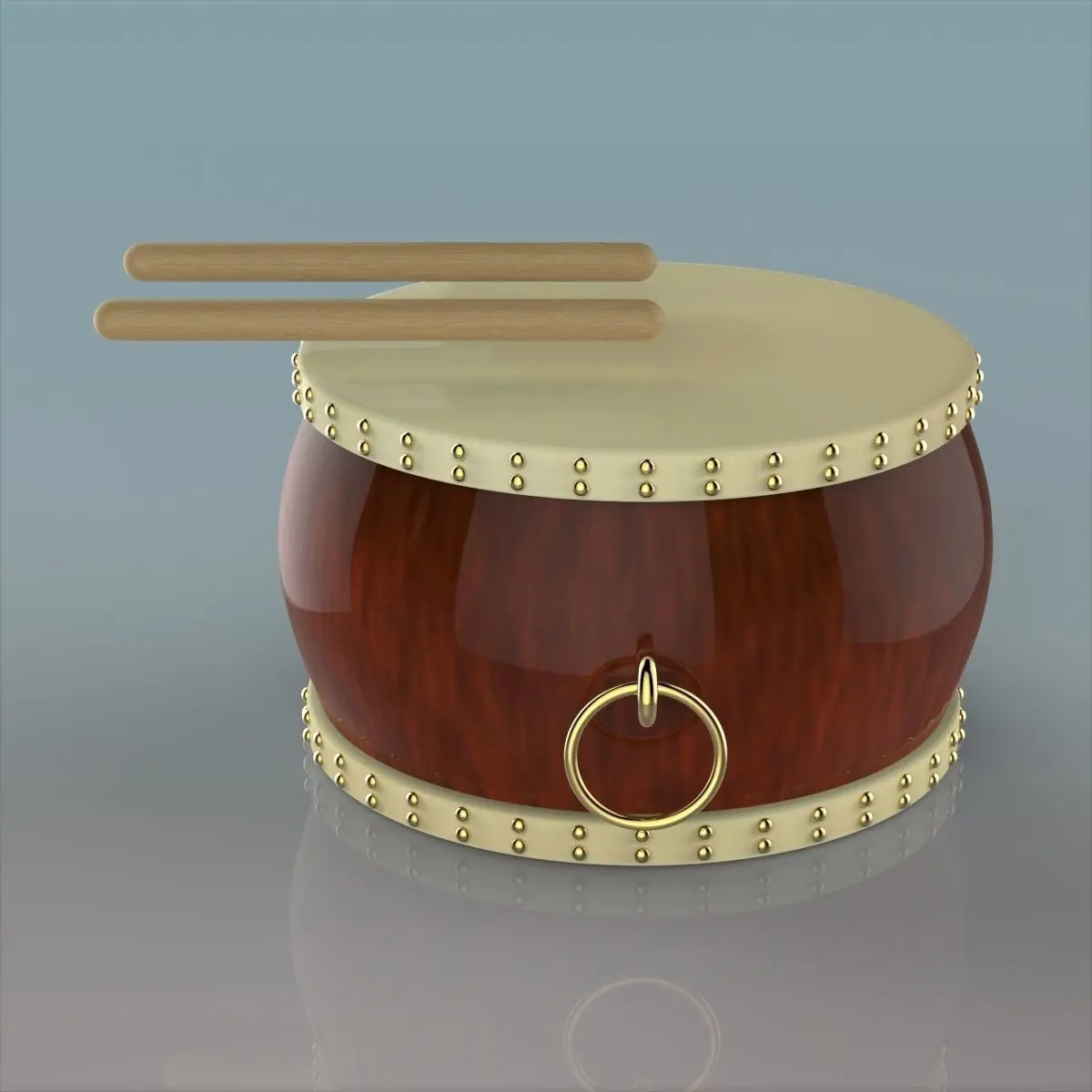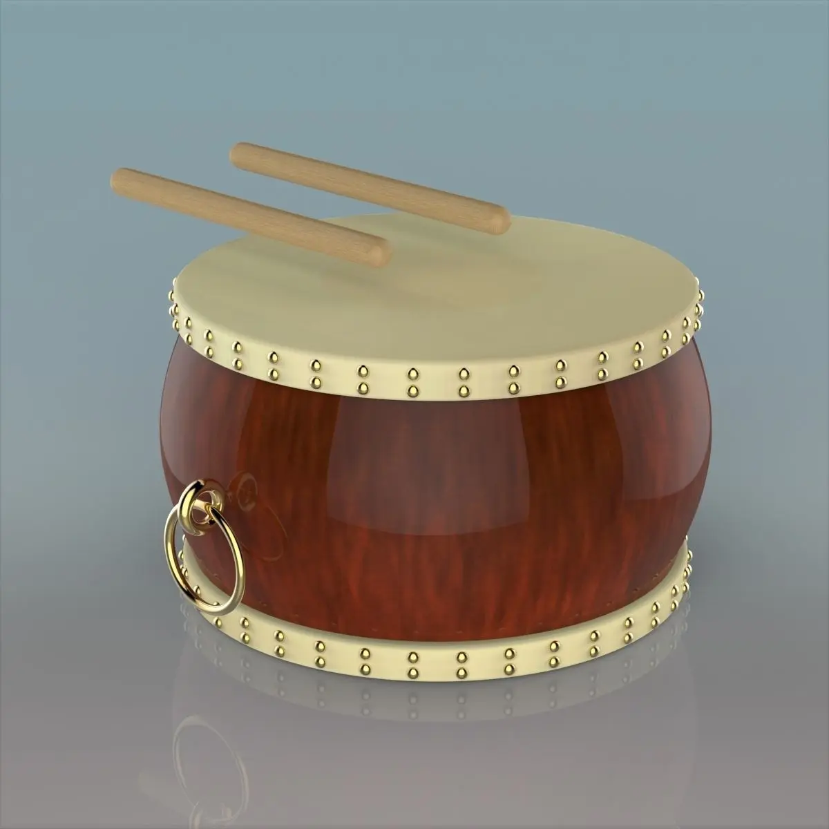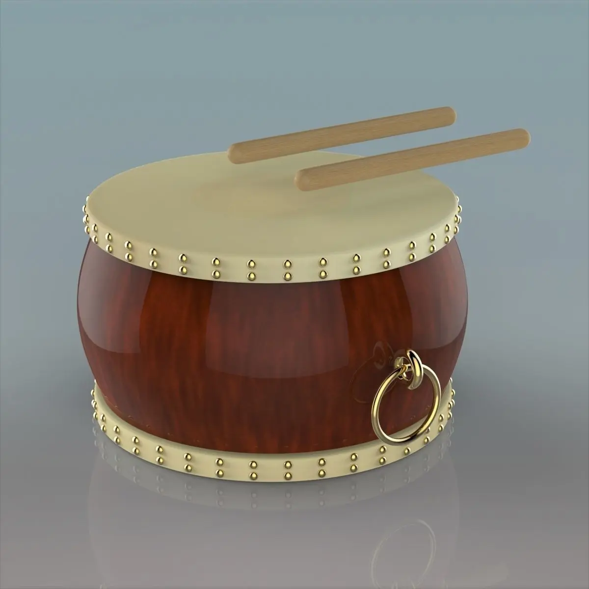 Here is 3d model of Chinese Drum was created from parts and named by objects and textures materials. Within a nice scene with good lighting it's easy to get pretty realistic results with this