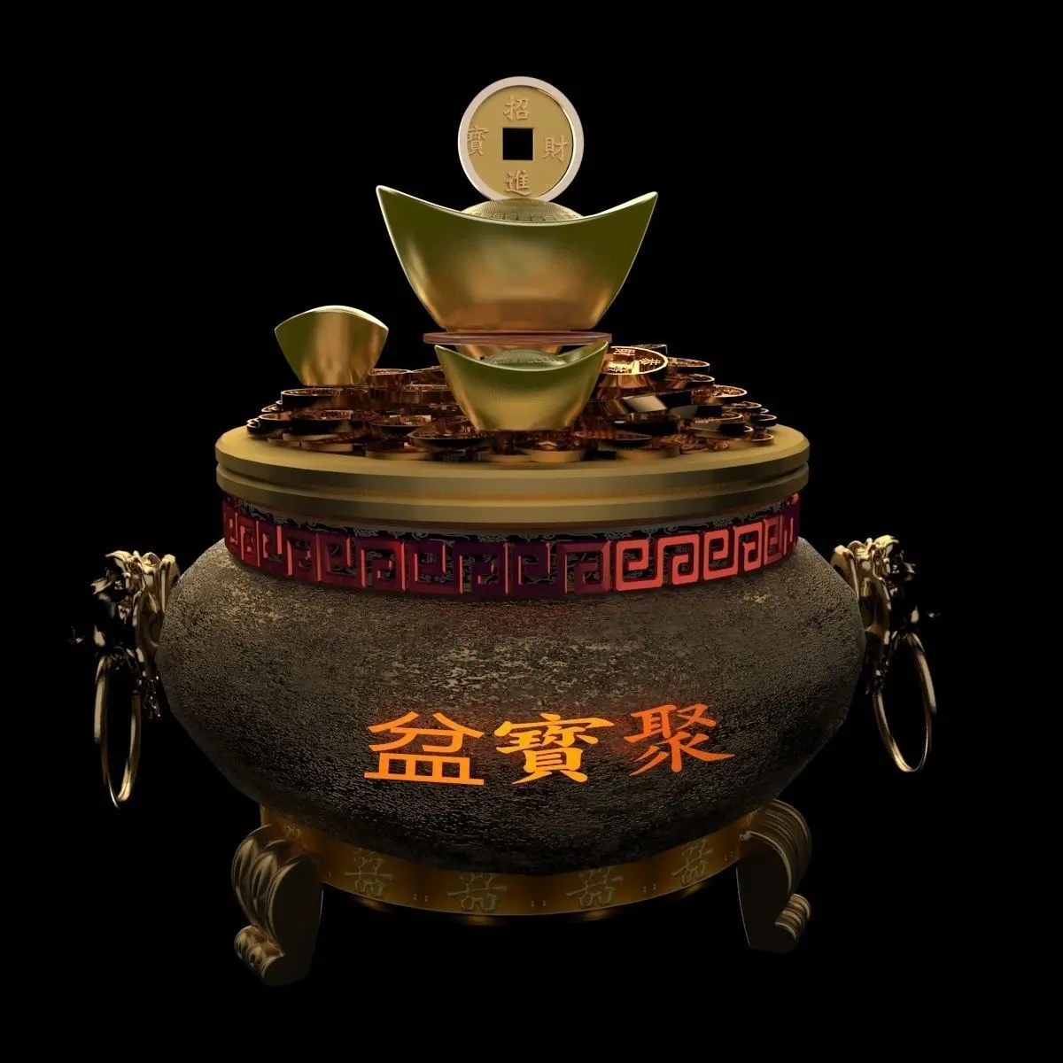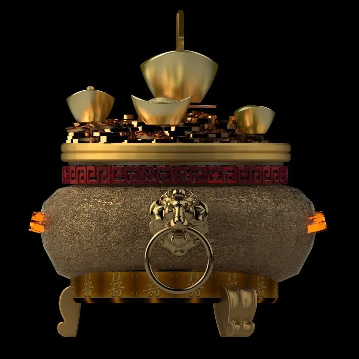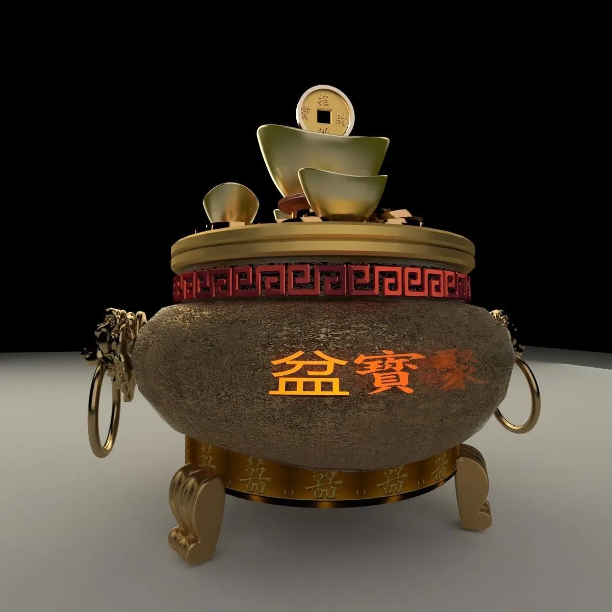 Chinese gold Ingot(Yuan Bao) pot 3D models created in 3D Max.(.max,.fbx) . All scene and texture map are included in Zip file. All scene are rendered by VRay version 3.00.07.Available files: chinese_yuanbao_treasure_bowlC.rar