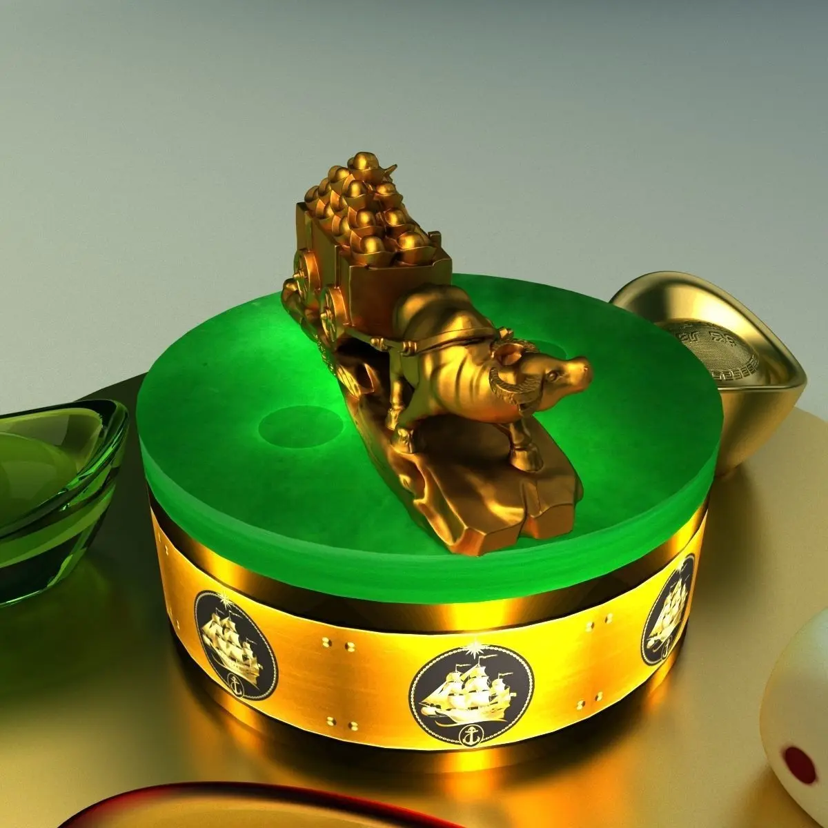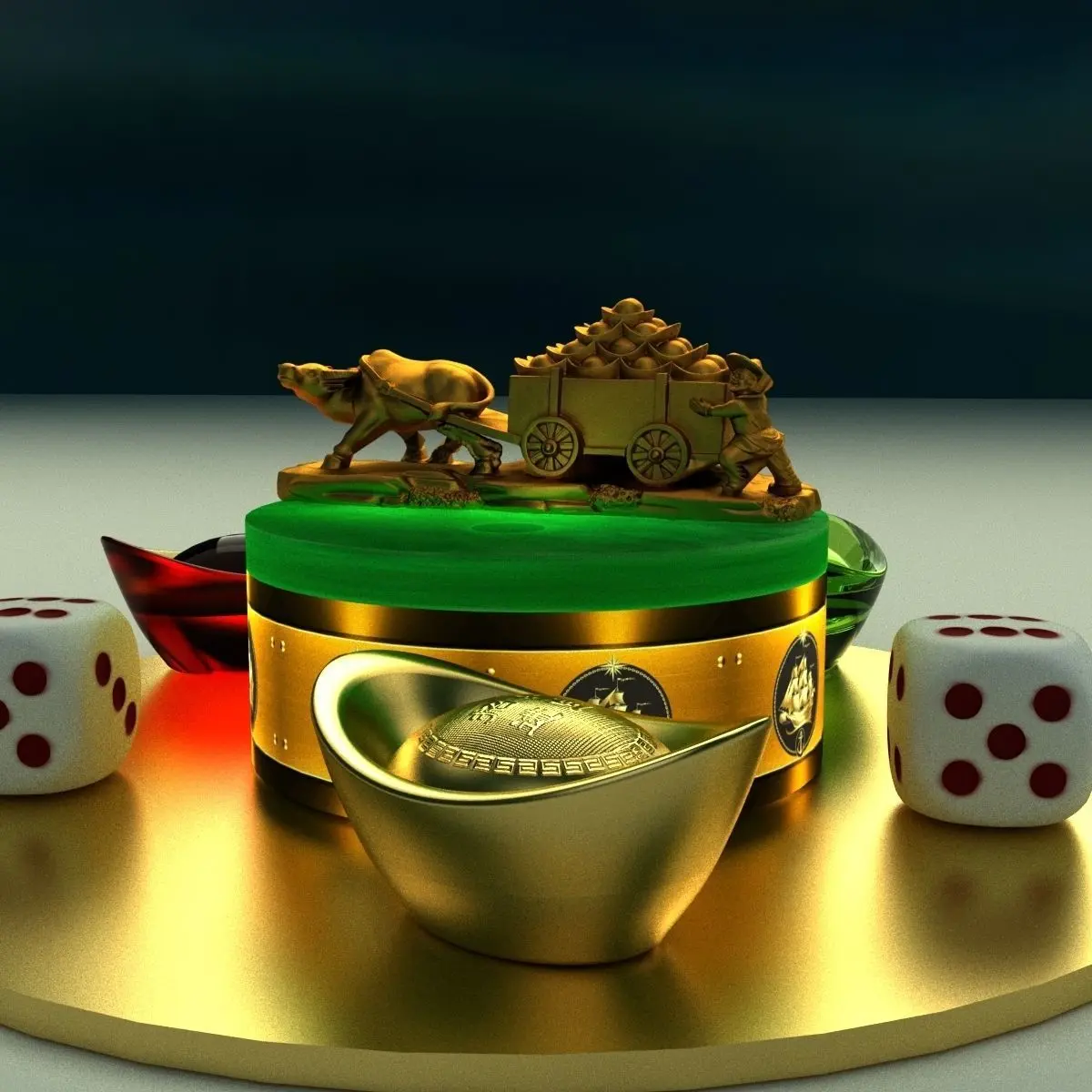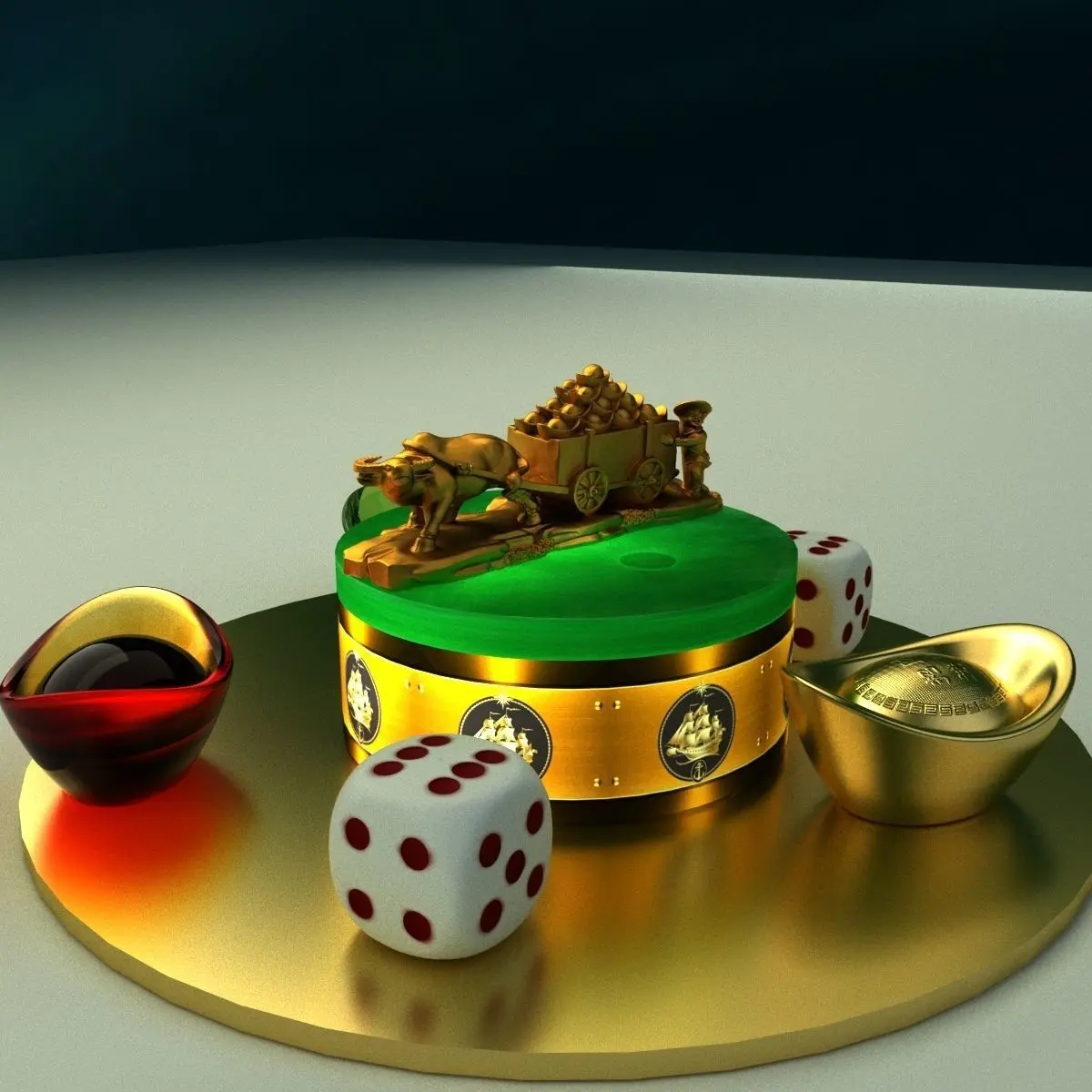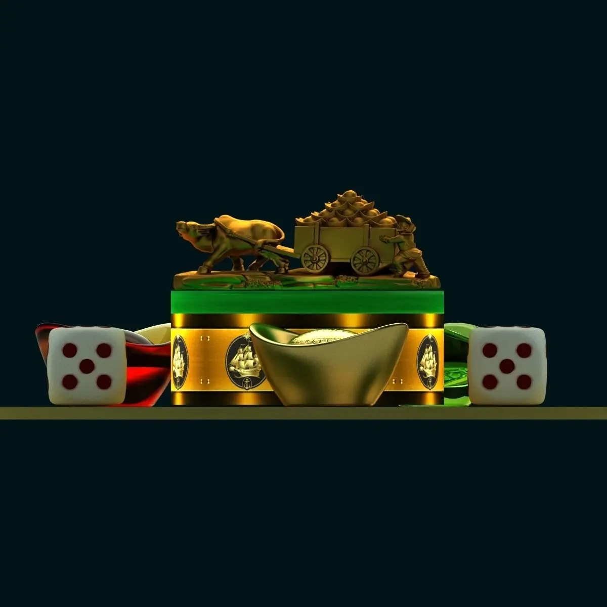 Chinese gold ingot and dice with gold cart 3D models created in 3D Max.(.max,.fbx). All scene and texture map are included in Zip file. Final images rendered with Vray.Available files: