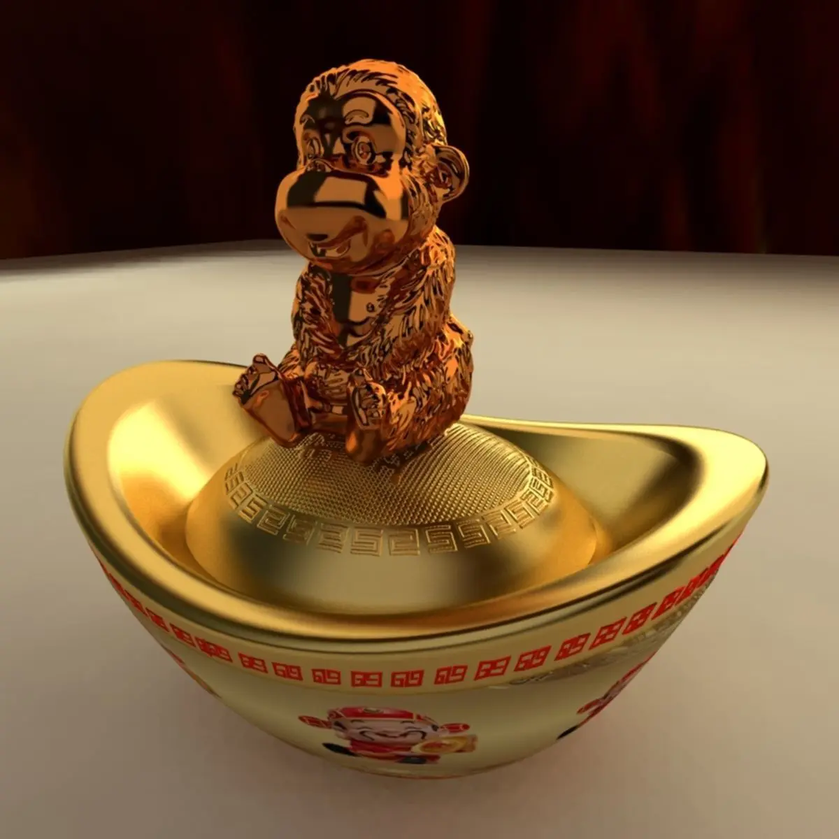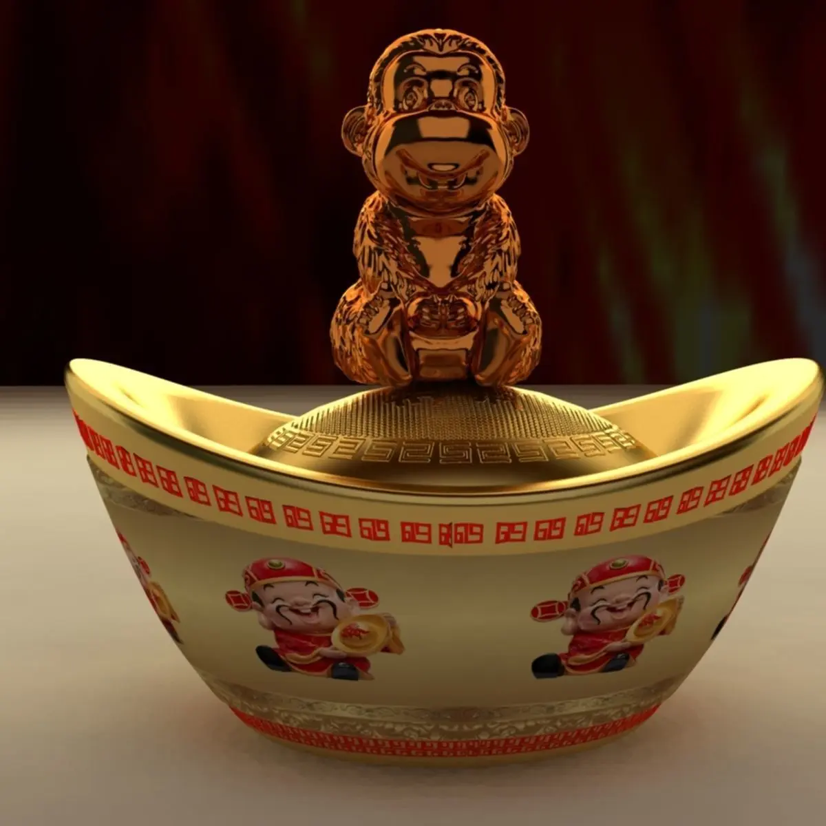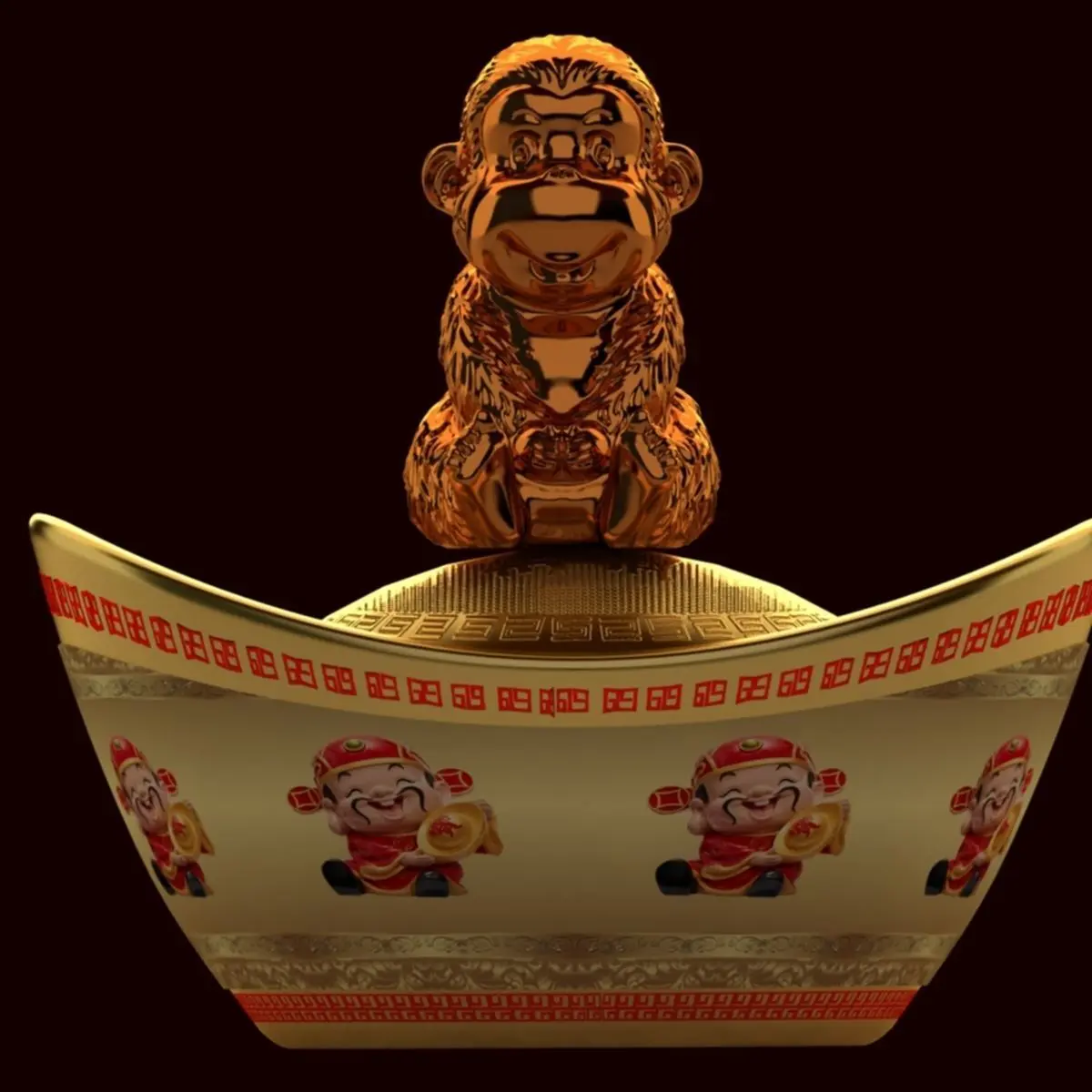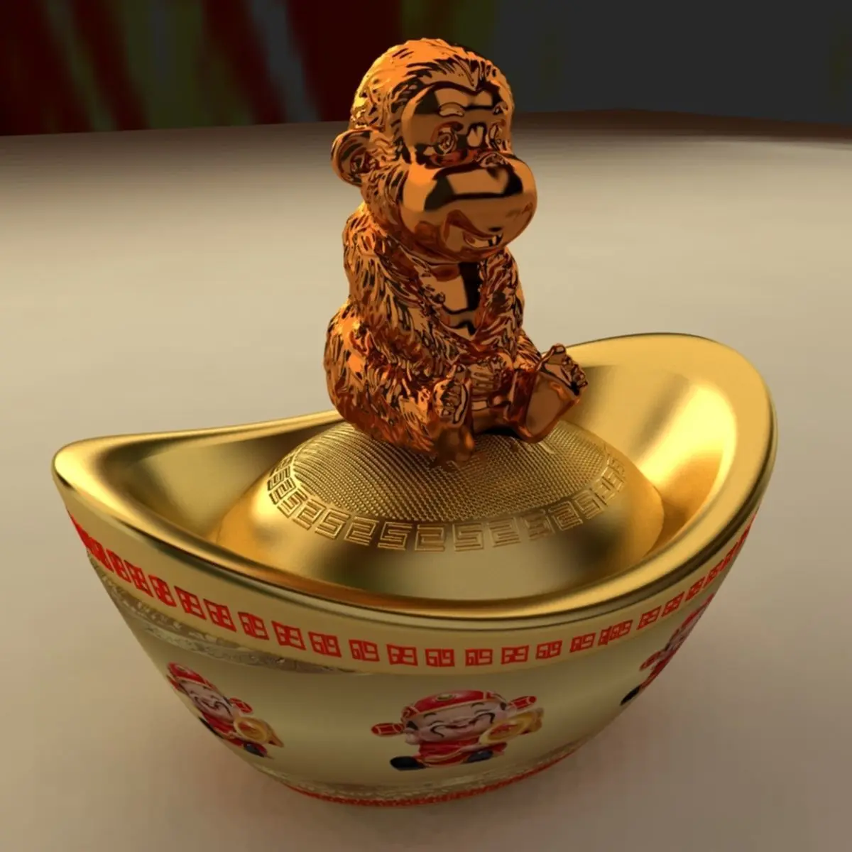 Chinese gold Ingot(Yuan Bao) monkey sculpture 3D models created in 3D Max.(.max,.obj,.stl) . All scene and texture map are included in Zip file. All scene are rendered by VRay.Available files: chinese_gold_ingotA.rarAvailable files: