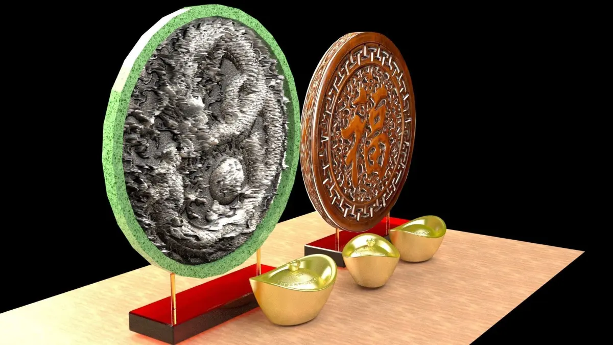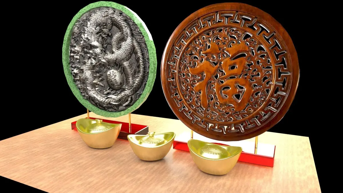 Chinese gold Ingot with dragon fu symbol and smooth symbol carving pattern 3D models created in 3D Max. All scene and texture map are included in Zip file. All scene are rendered by v-Ray.Available files: chinese_fu_dragon_patternA zip file