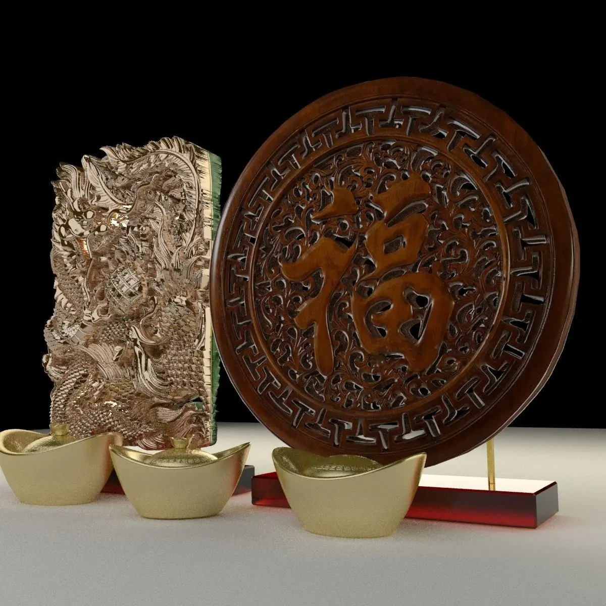 Chinese gold Ingot(Yuan Bao) with fu symbol and dragon phoenix carving pattern 3D models created in 3D Max.(.max,.obj,.stl) . All scene and texture map are included in Zip file. All scene are rendered by VRay.Available files: chinese_fu_patternA.rar