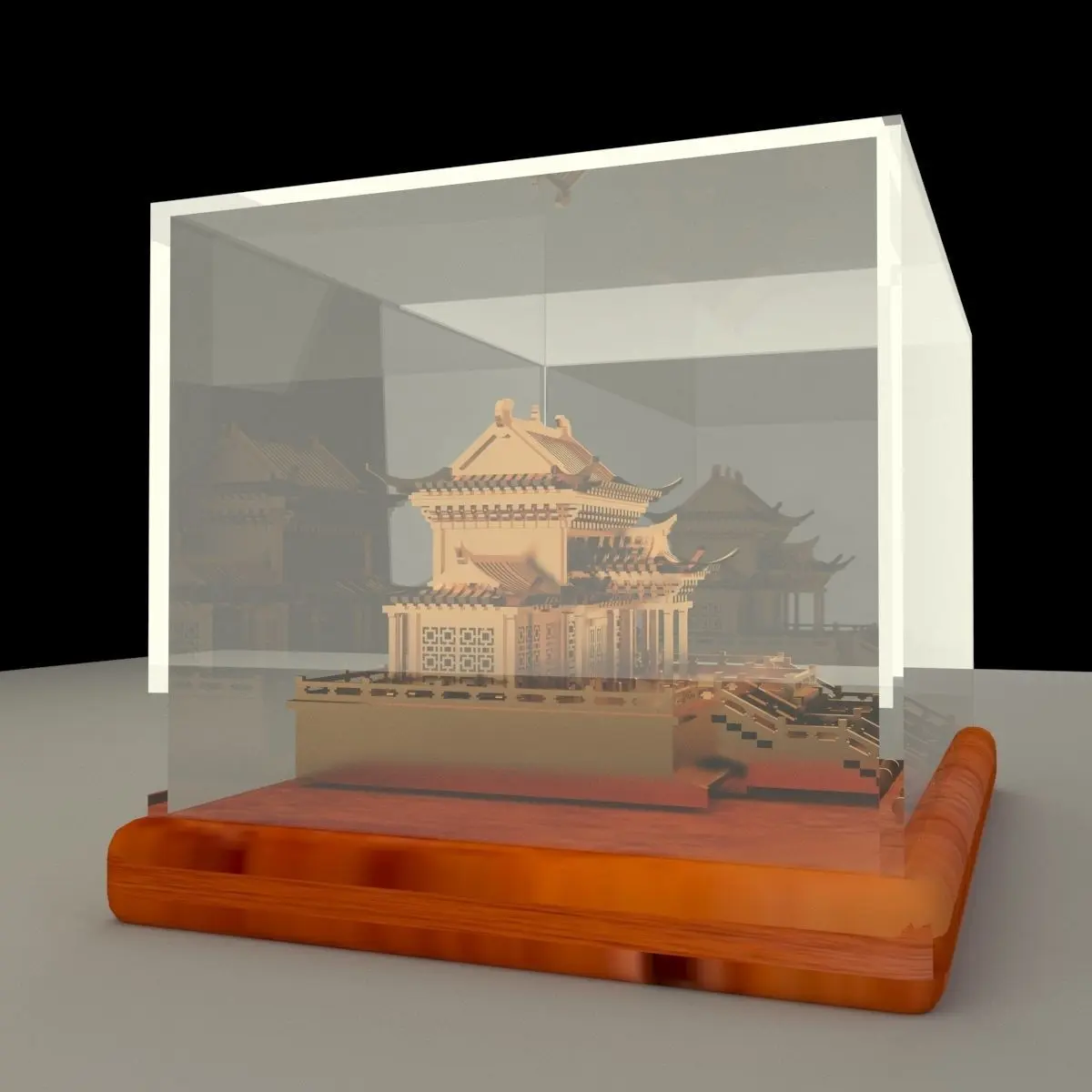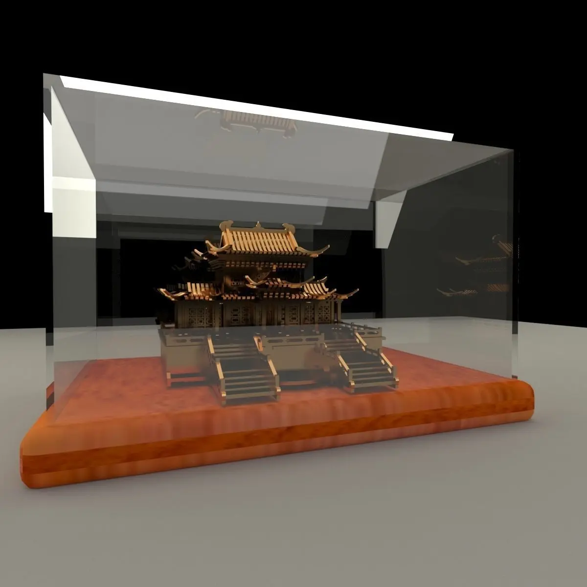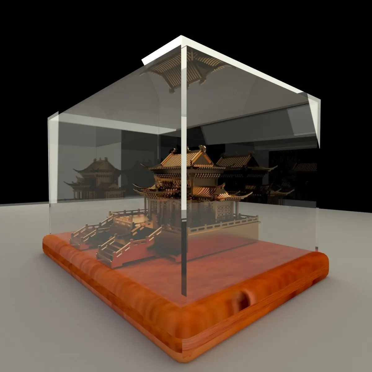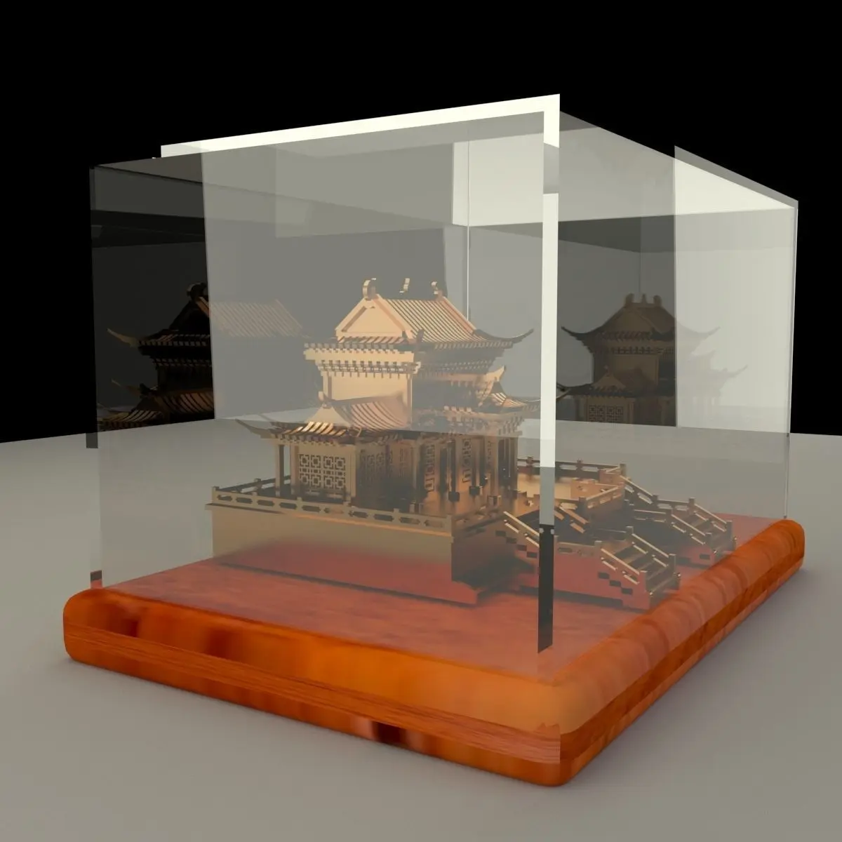 Chinese golden house in glass display box stand 3D models created in 3D Max.(.max,.obj,.stl) . All scene and texture map are included in Zip file. All scene are rendered by VRay.Available files: chinese_glass_box_houseA zip fileAvailable files: