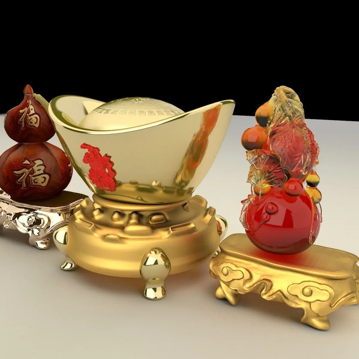 Chinese gold Ingot(Yuan Bao) and gourd 3D models created in 3D Max.(.max,.obj,.stl) . All scene and texture map are included in Zip file. All scene are rendered by VRay.Available files: chinese_yuanbao_wooden_gourdA.rar