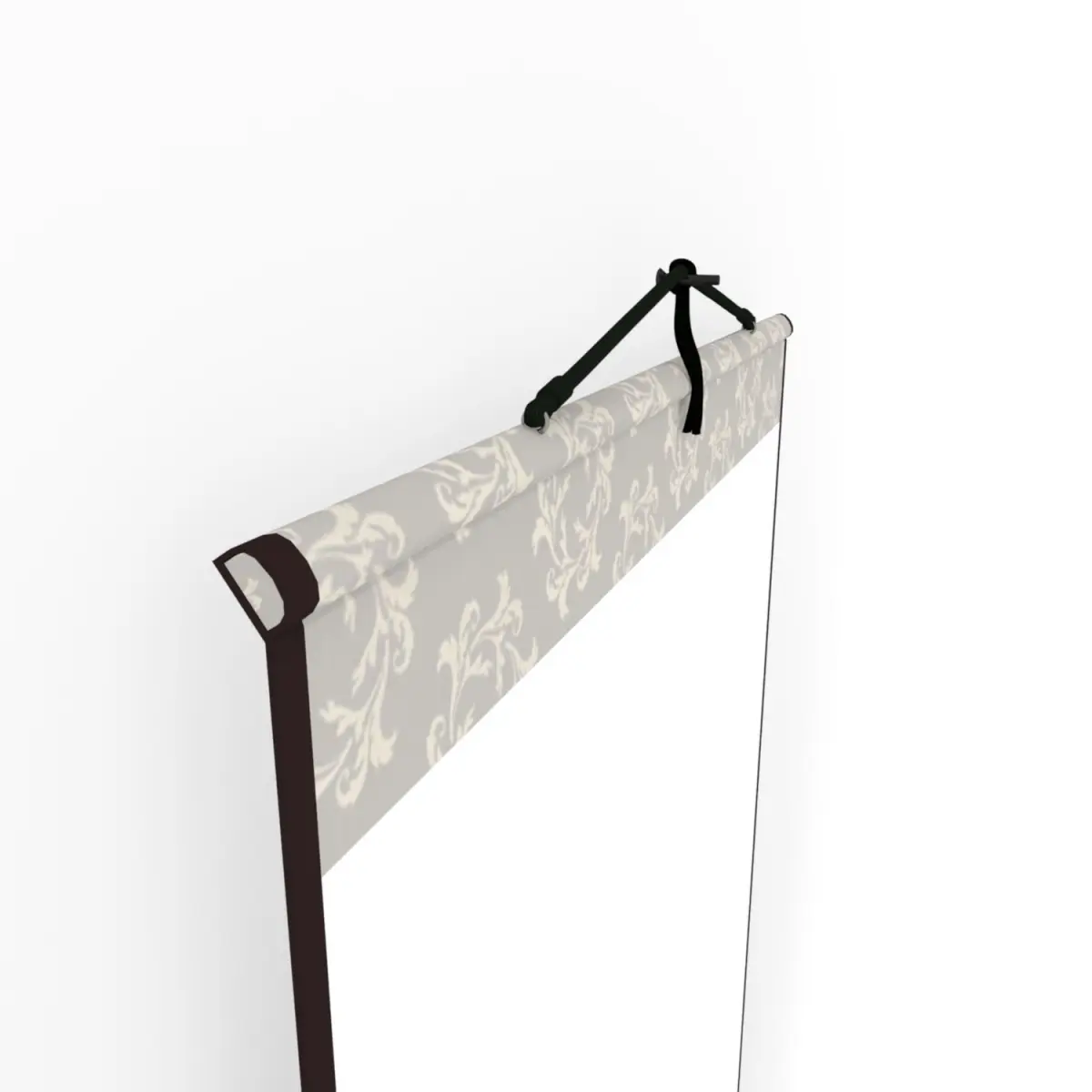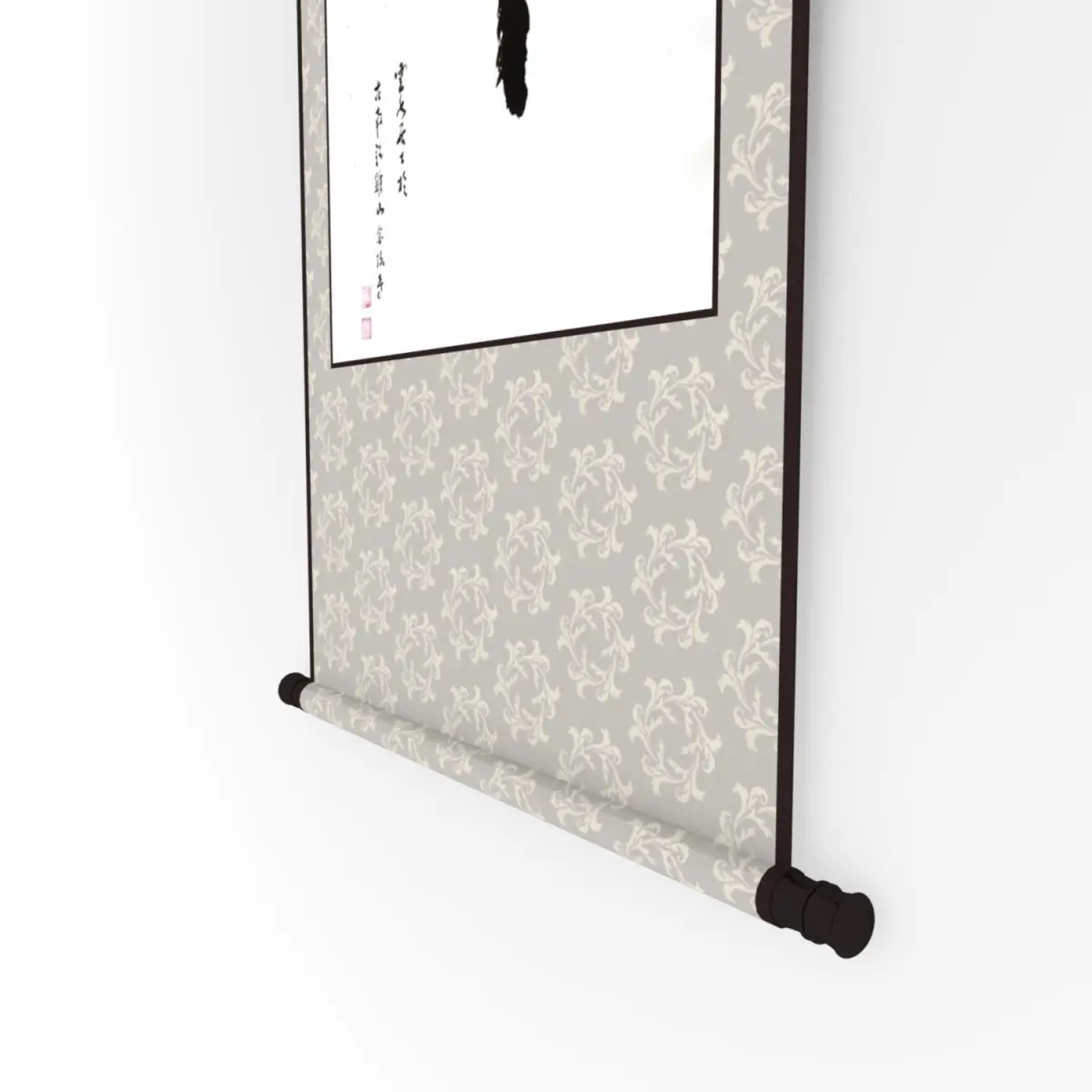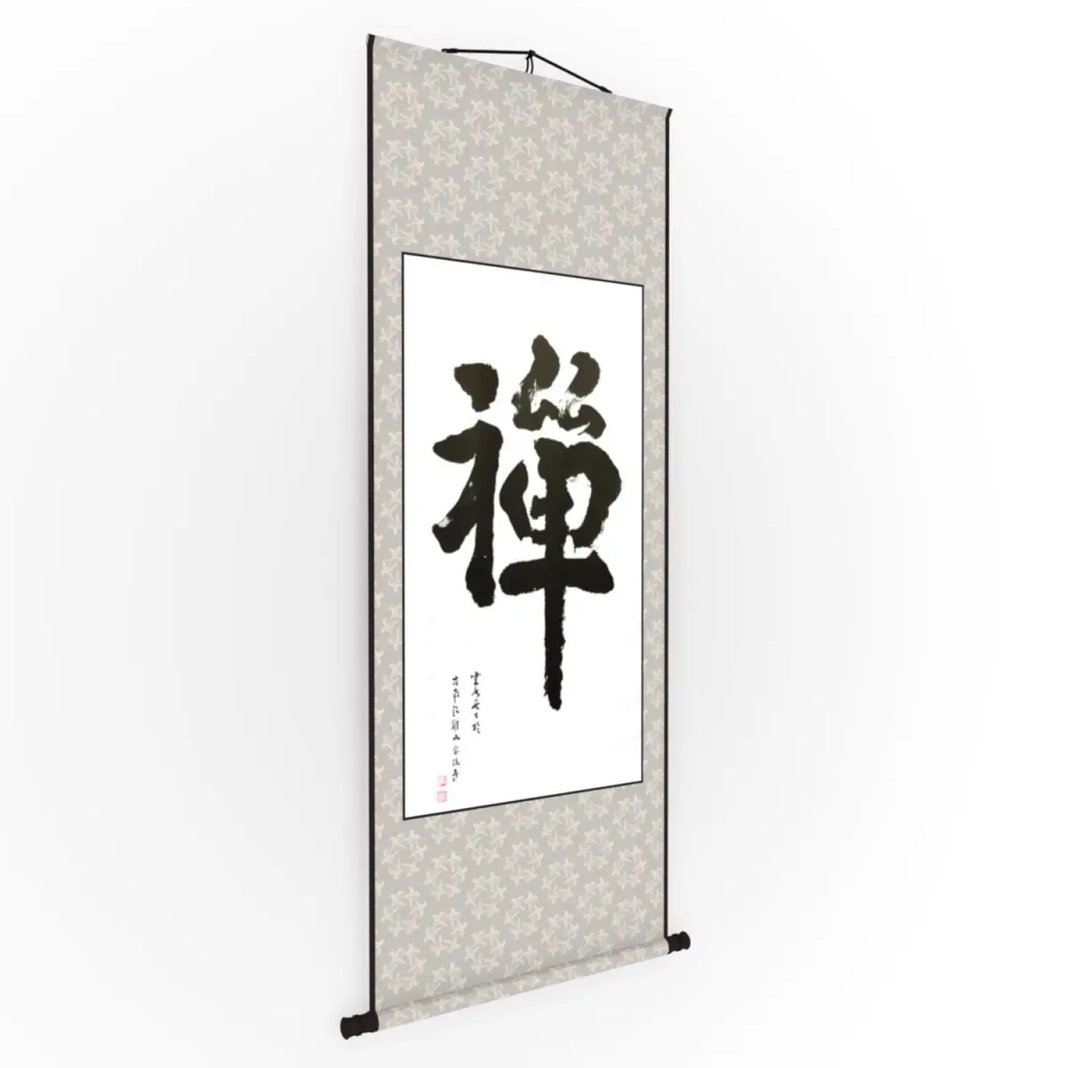 A hanging scroll is a traditional ways to display and exhibit Chinese painting and calligraphy. The hand-written Chinese calligraphy character 'Zen' means Zen Buddhism, meditation, contemplation.