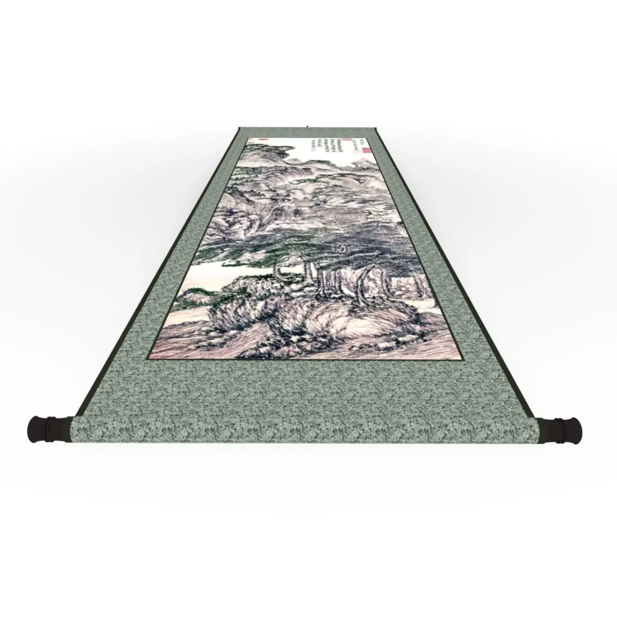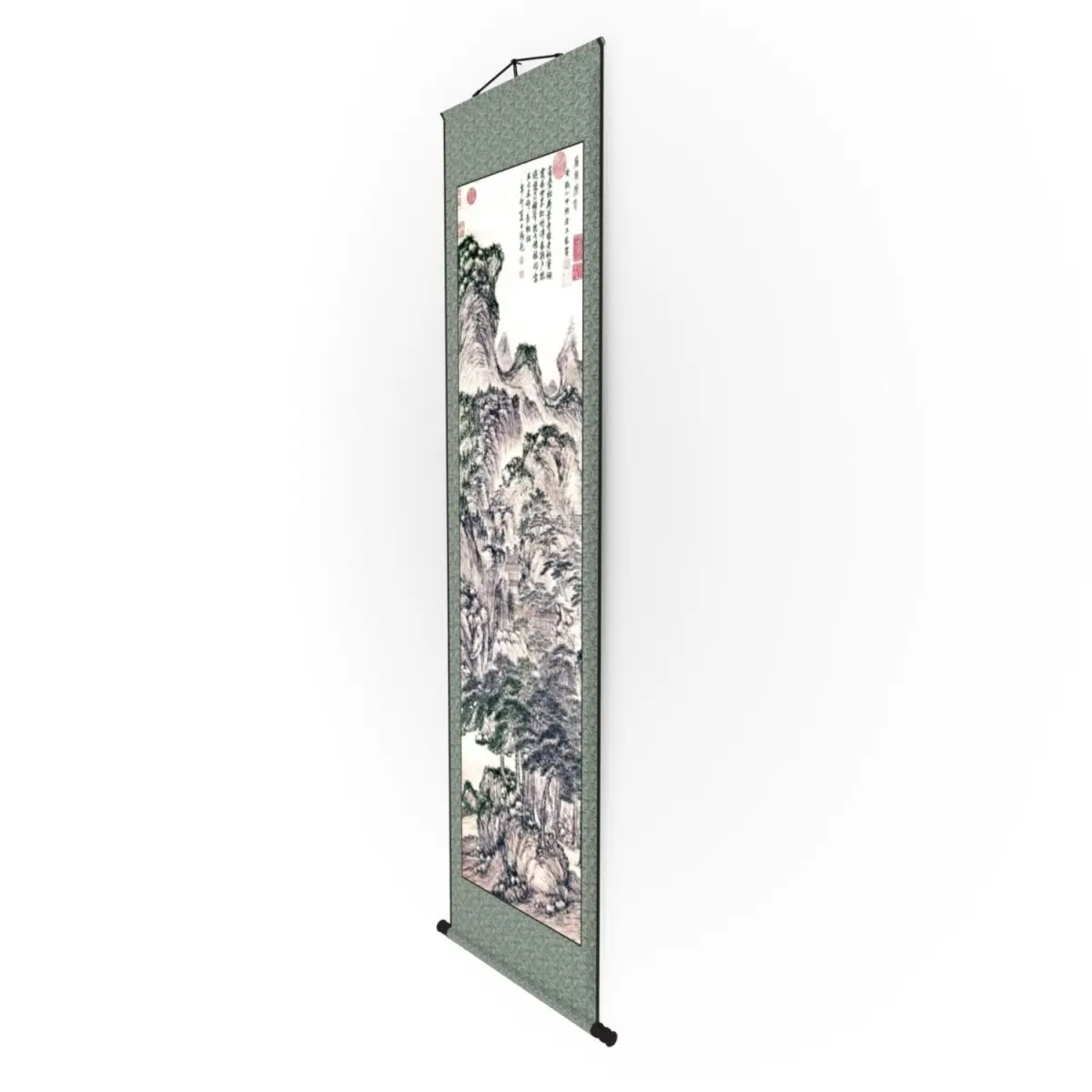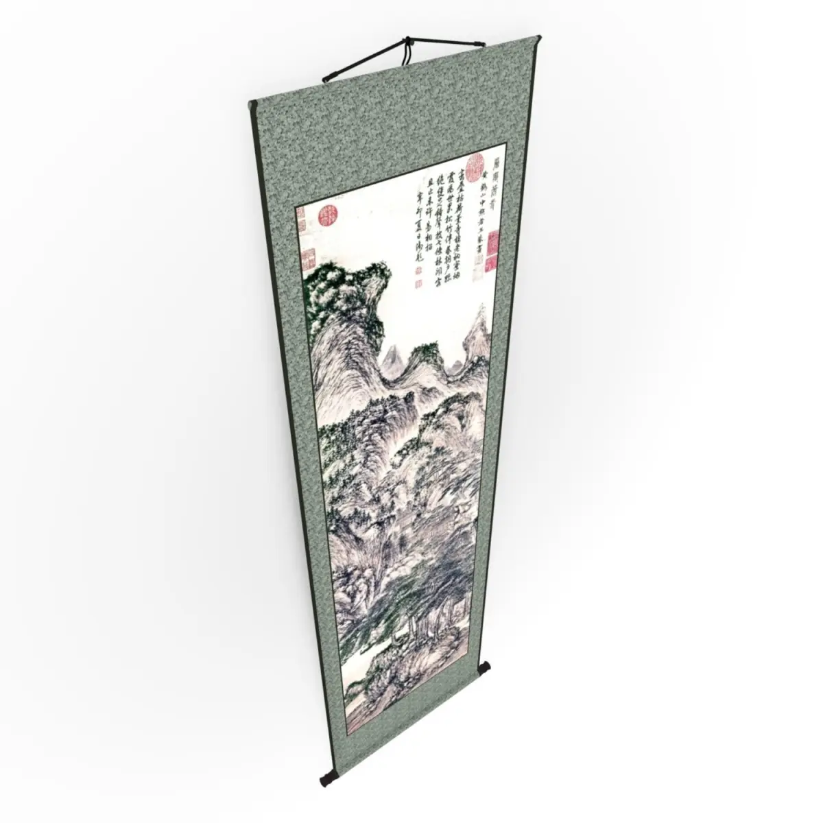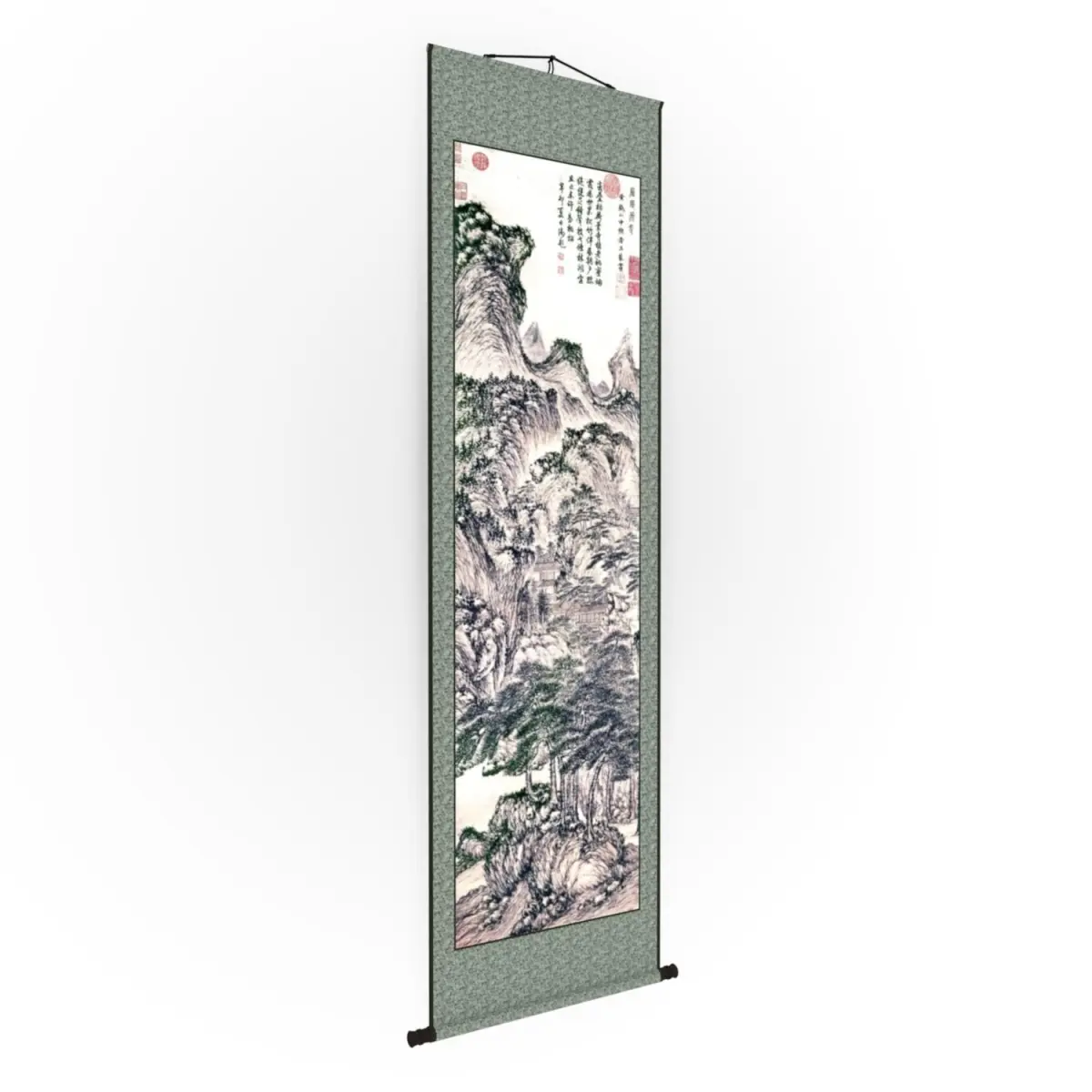 A hanging scroll is a traditional ways to display and exhibit Chinese painting and calligraphy. The painting depict Chinese Mountain Scenery.