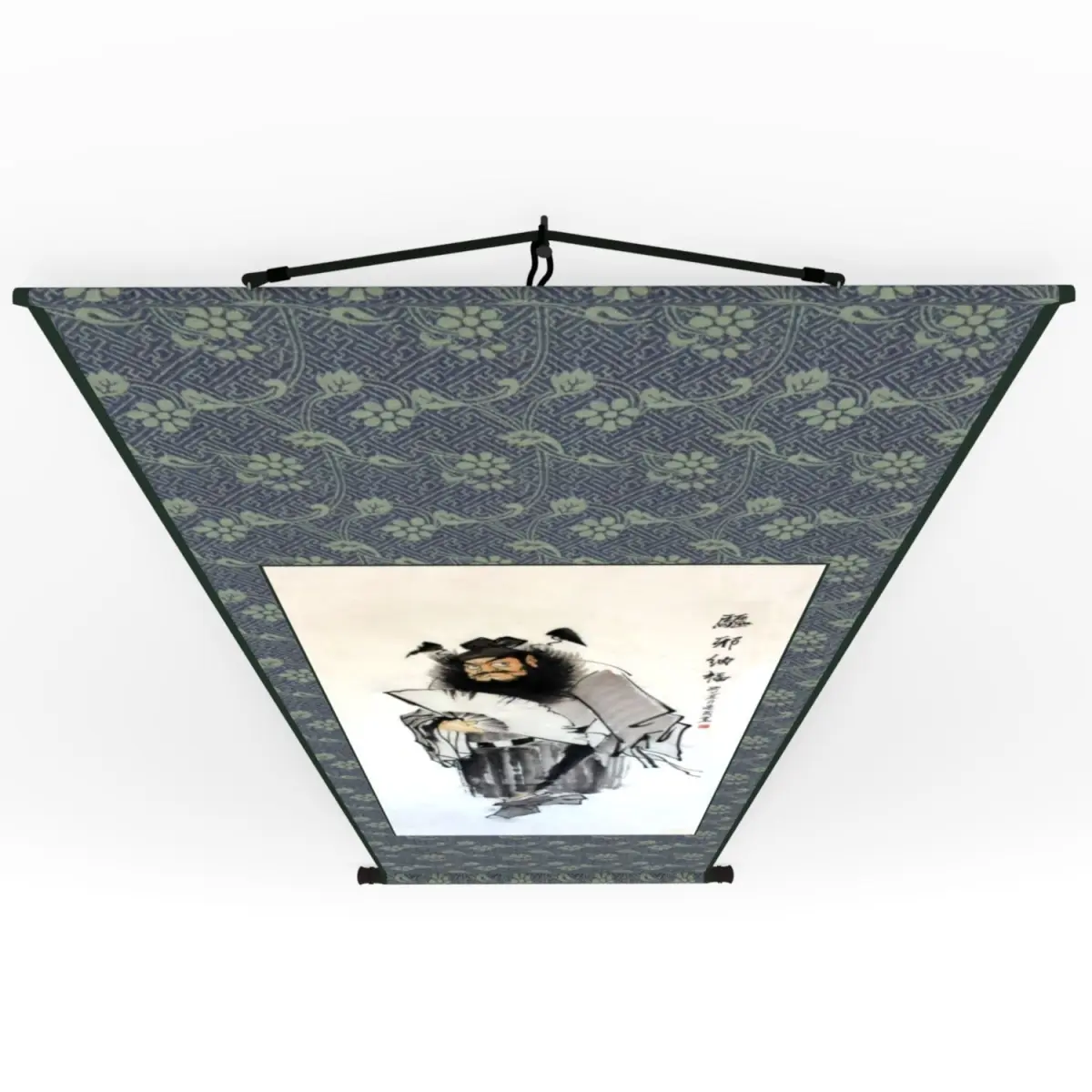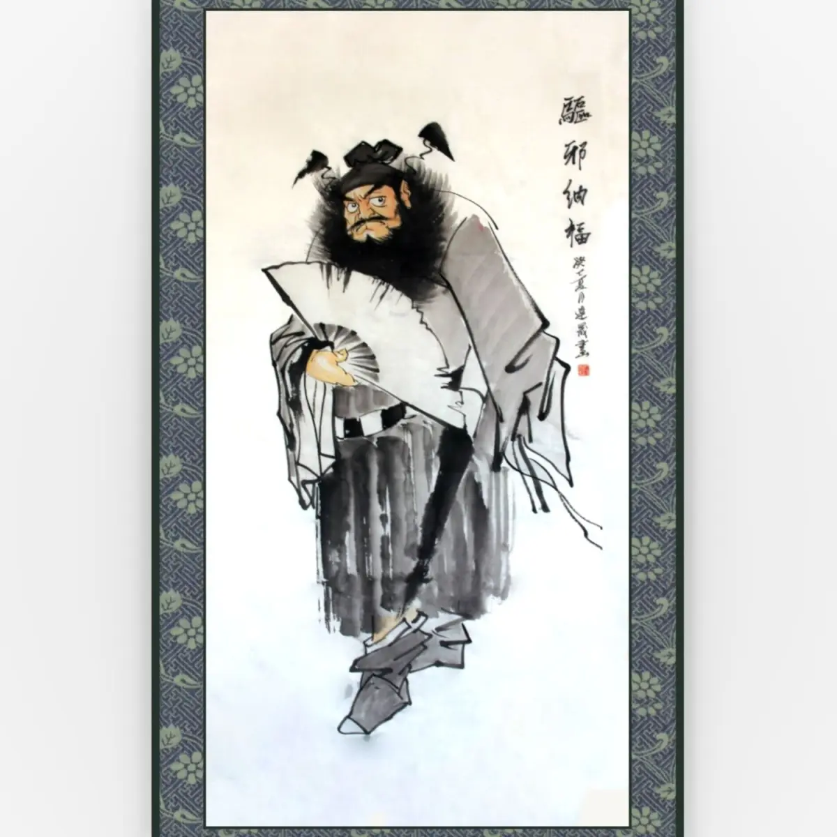 A hanging scroll is a traditional ways to display and exhibit Chinese painting and calligraphy. The painting depict Zhong Gui who is a mythical person figuring in Chinese tales and stories as a fighter against demons and evil spirits.
