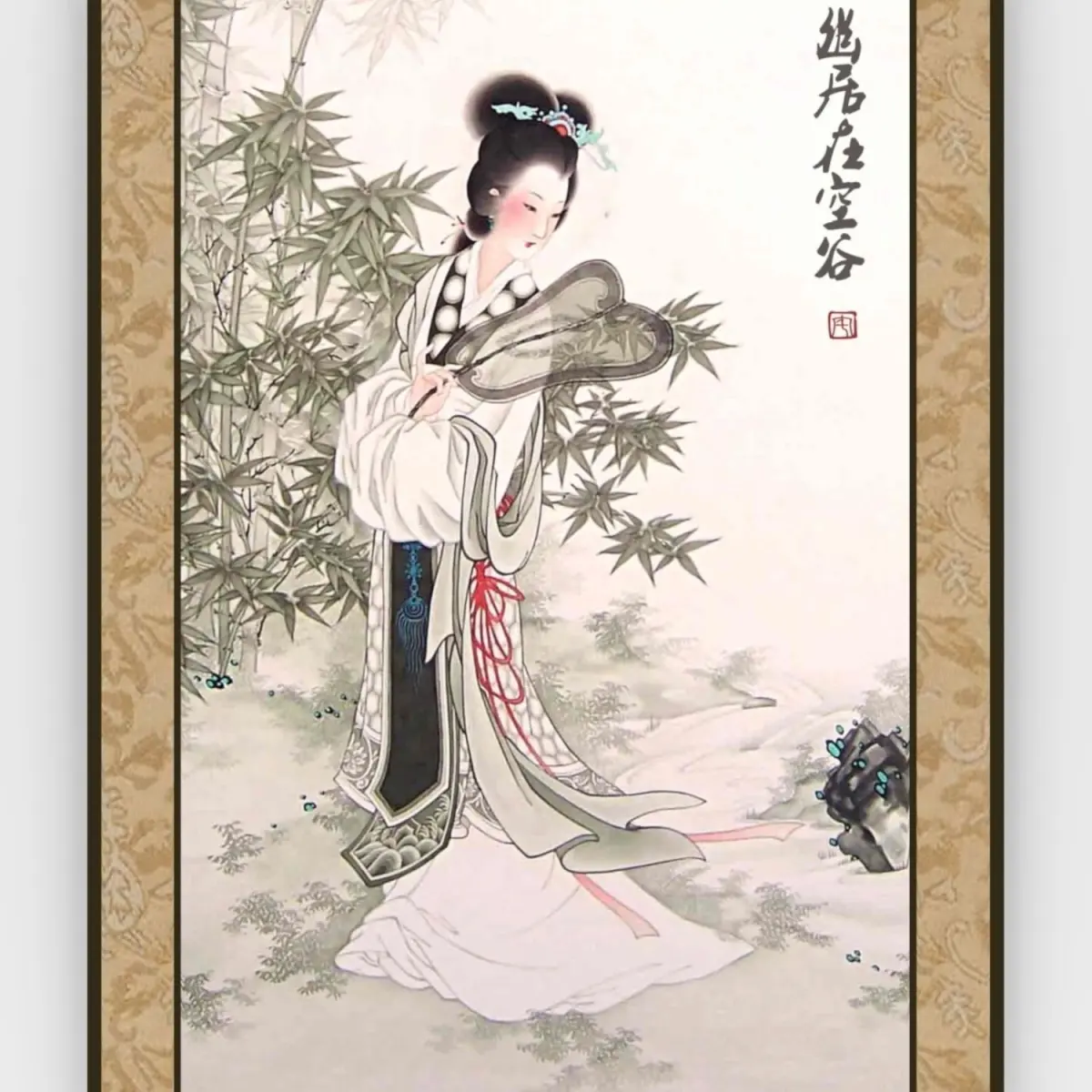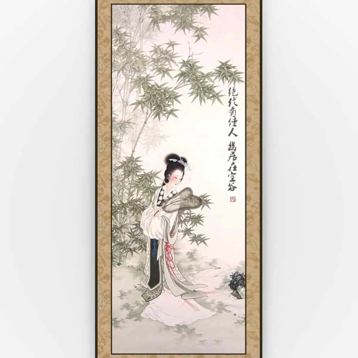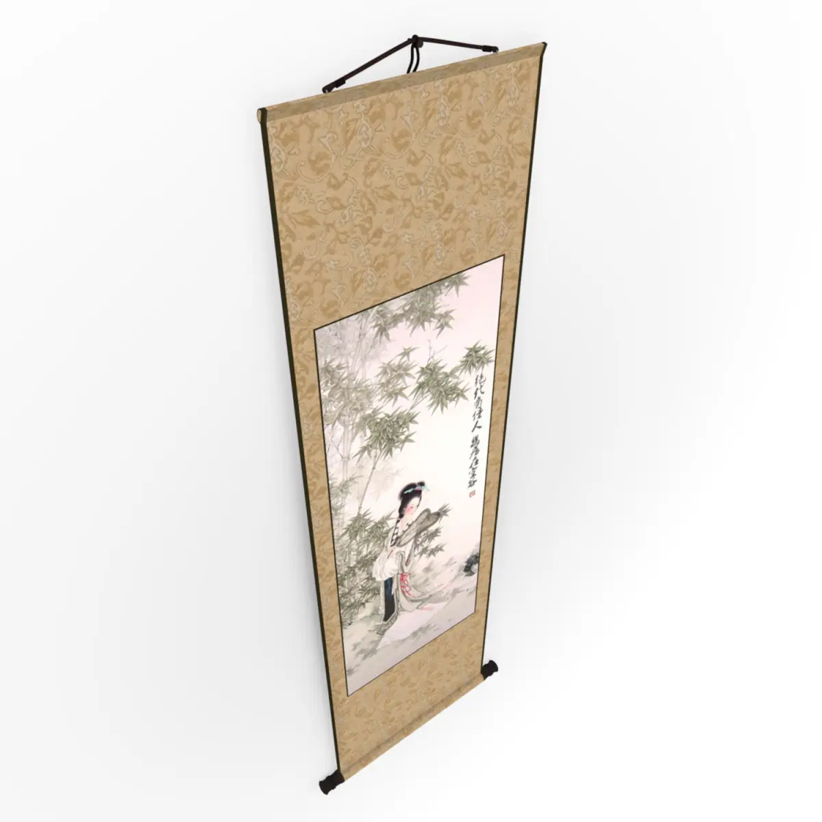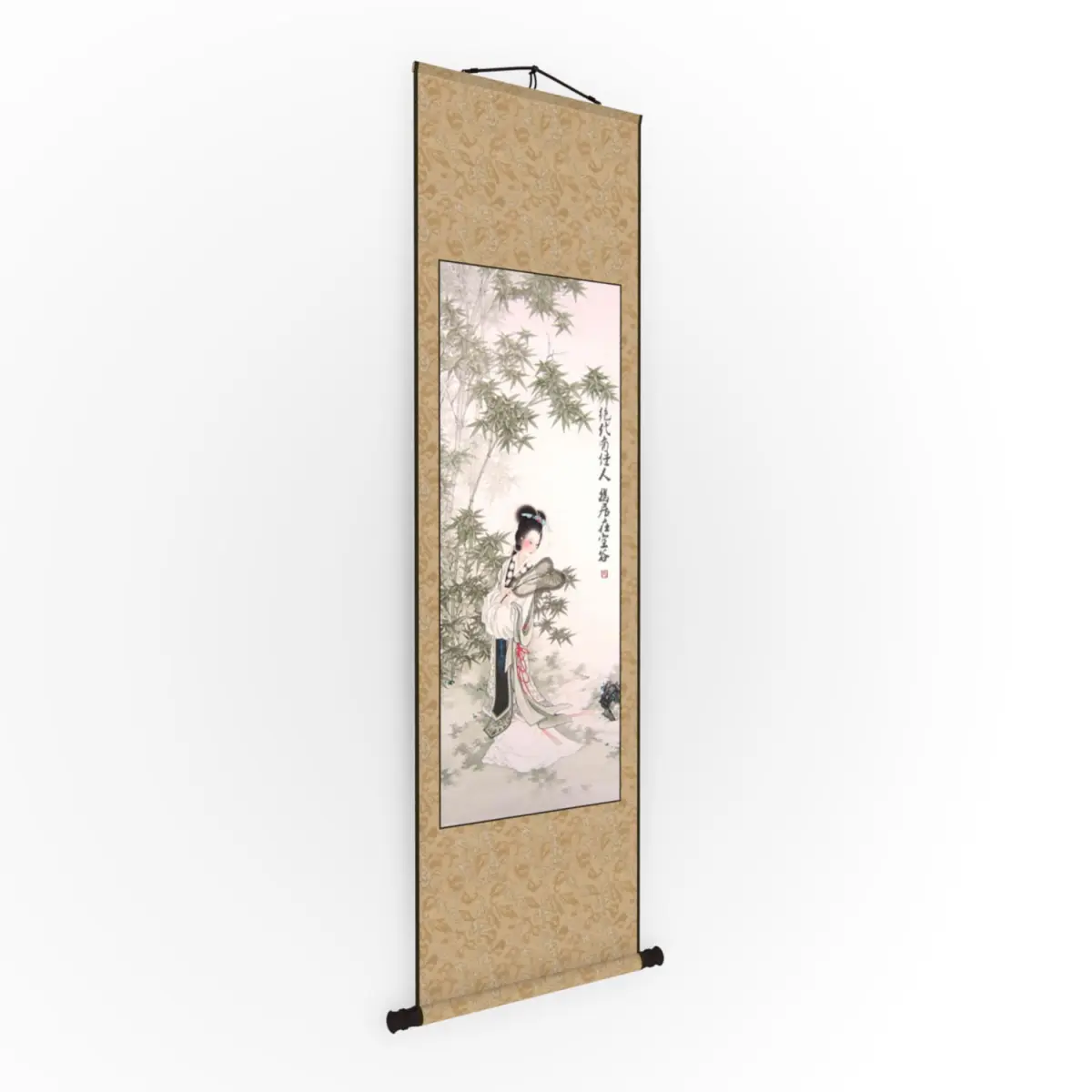 A hanging scroll is a traditional ways to display and exhibit Chinese painting and calligraphy. The painting depict an ancient lady in the bamboo grove.