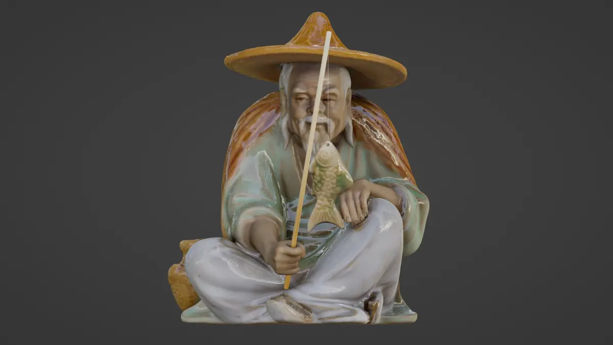Chinese fisherman ceramic figurine. Good to decorate interior home designs or game asset. It comes with 4k difuse, 4k roughness and 4k ambient occlusion textures; UVmap, all based on a highquality 3dscan and yet cleaned up, ready to use and customizable. The rod, line and fish included are also removable and customizable.