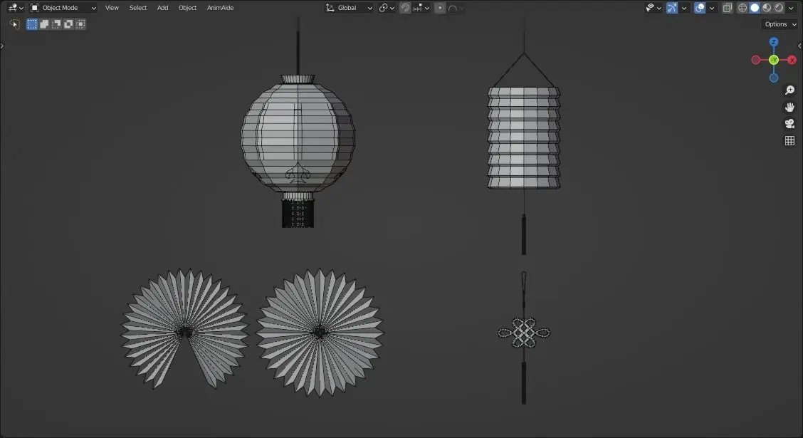 Lanter 1: Verts - 2074 Polygons - 1091Lantern 2: Verts - 772 Polygons - 594Knot Tassel: Verts - 2184 Polygons - 2057Fan (Closed): Verts - 128 Polygons - 64Fan (Open): Verts - 130 Polygons - 64