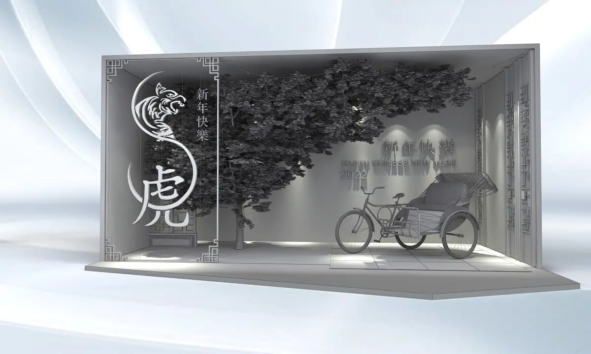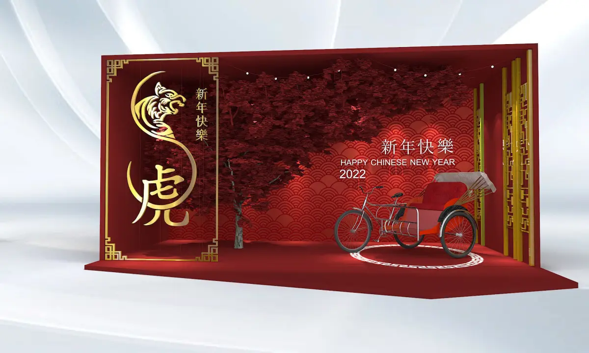 Custom build design staging and backdrop for Chinese New Year festive season. Design for instagramable photo taking with a traditional trishaw and a festive season.
