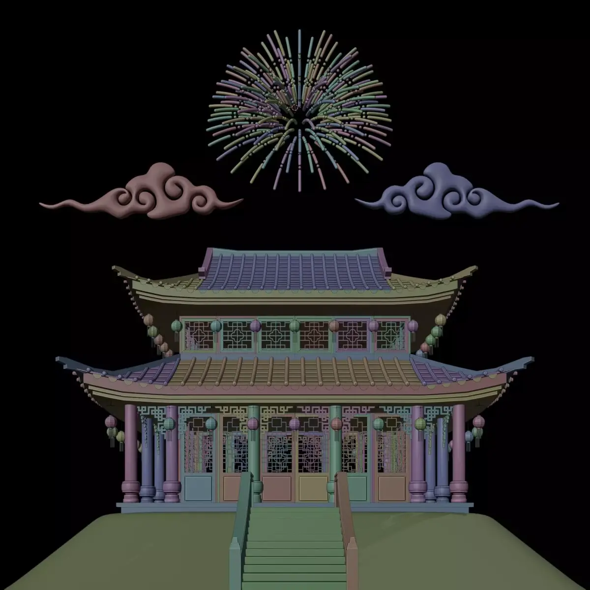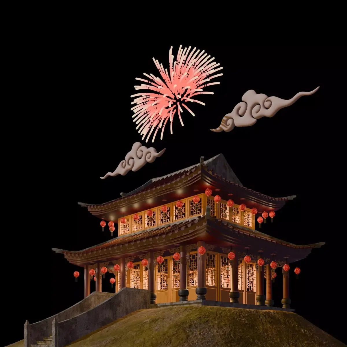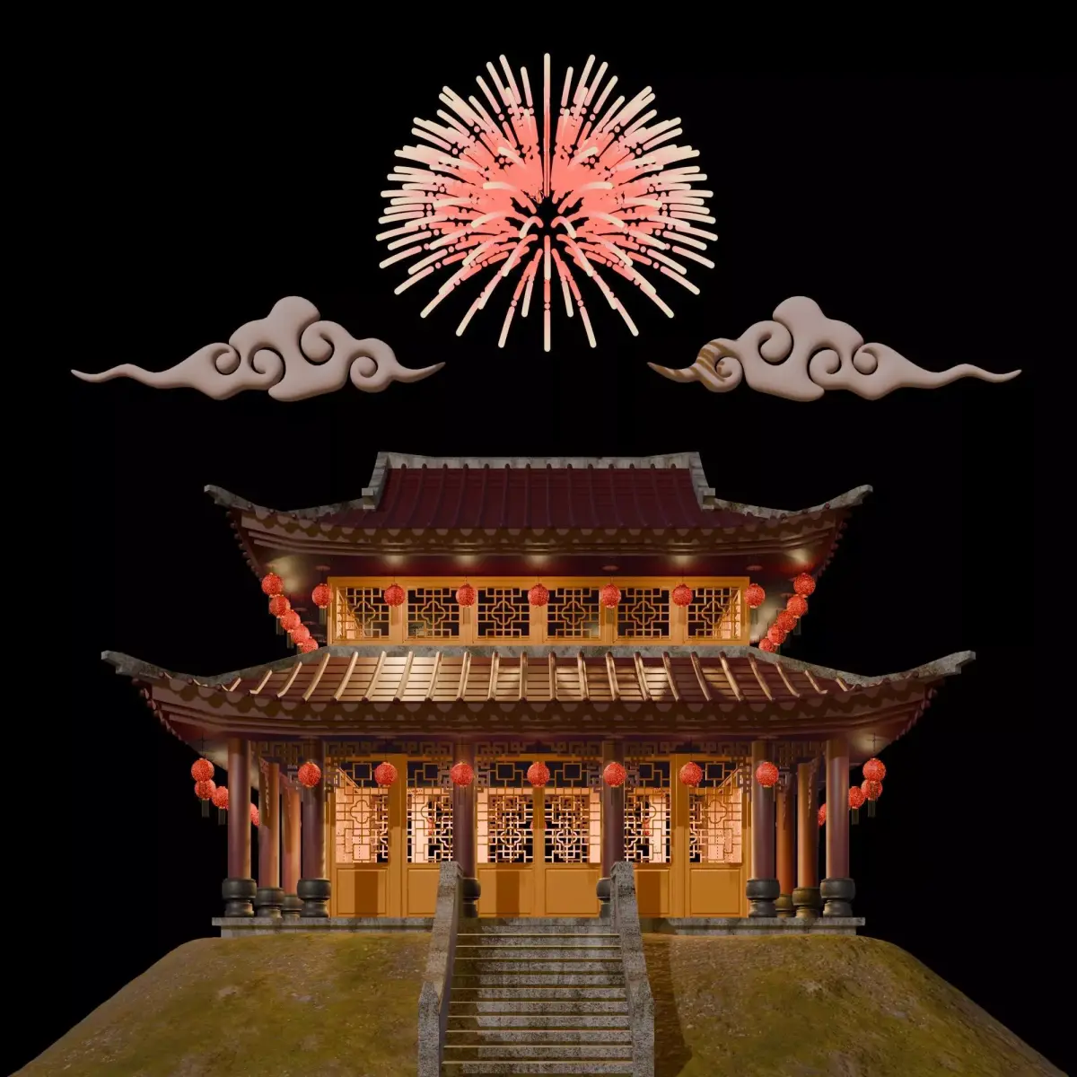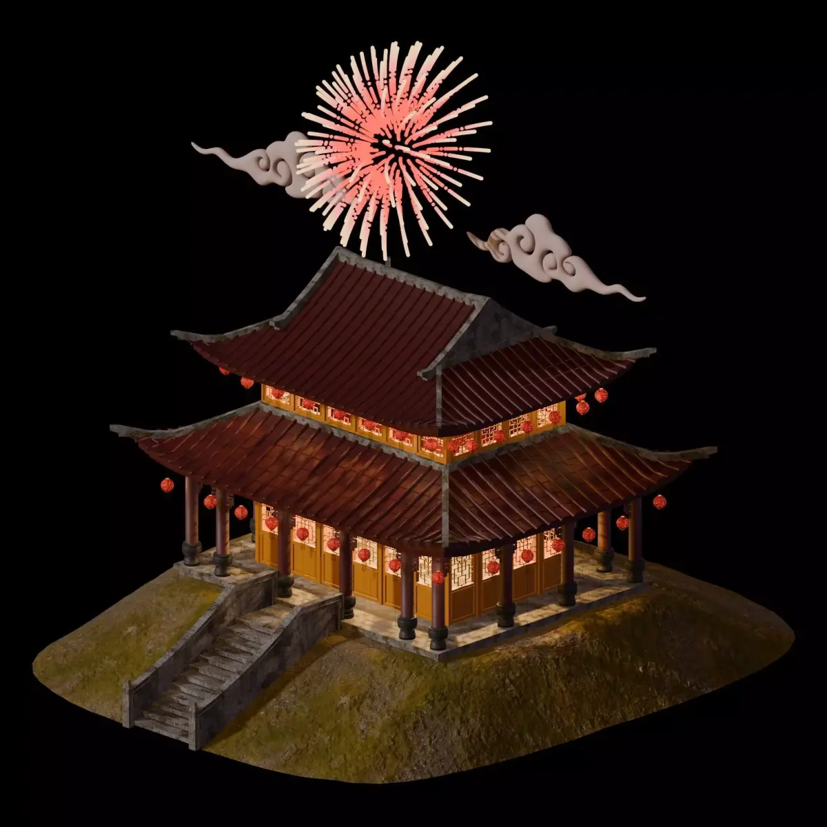 2 stories traditional Chinese building, with clouds, and fireworks. Showing a Chinese New Year vibes. Originally made in Blender, also available in .OBJ and .FBX file